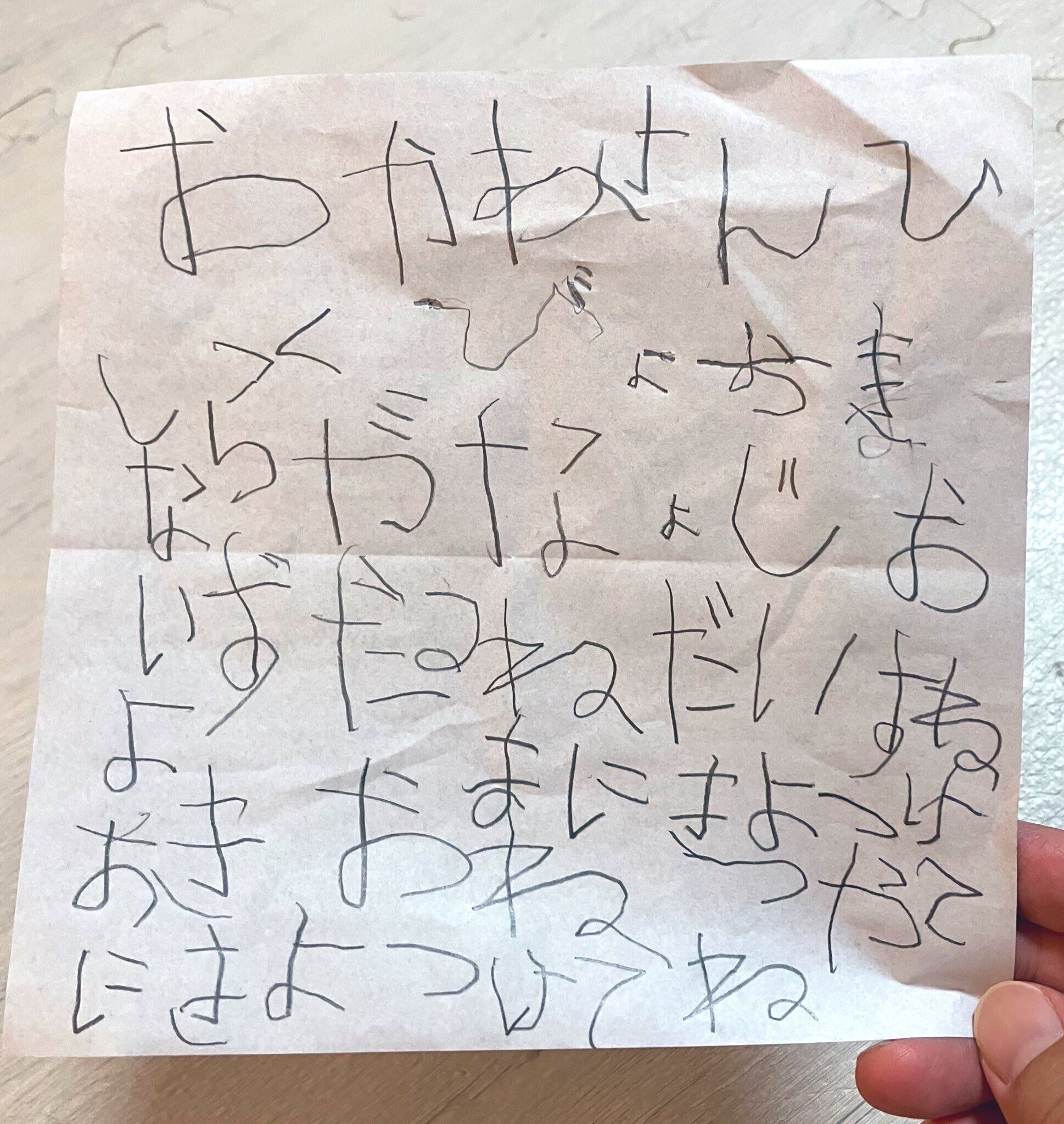 おそらく「おかあさん ひらがなじょおずだね だいすき おねつやびょおきしないよおにきよつけてね くるまにきよつけてね」と書いてあるのでは、とのこと。