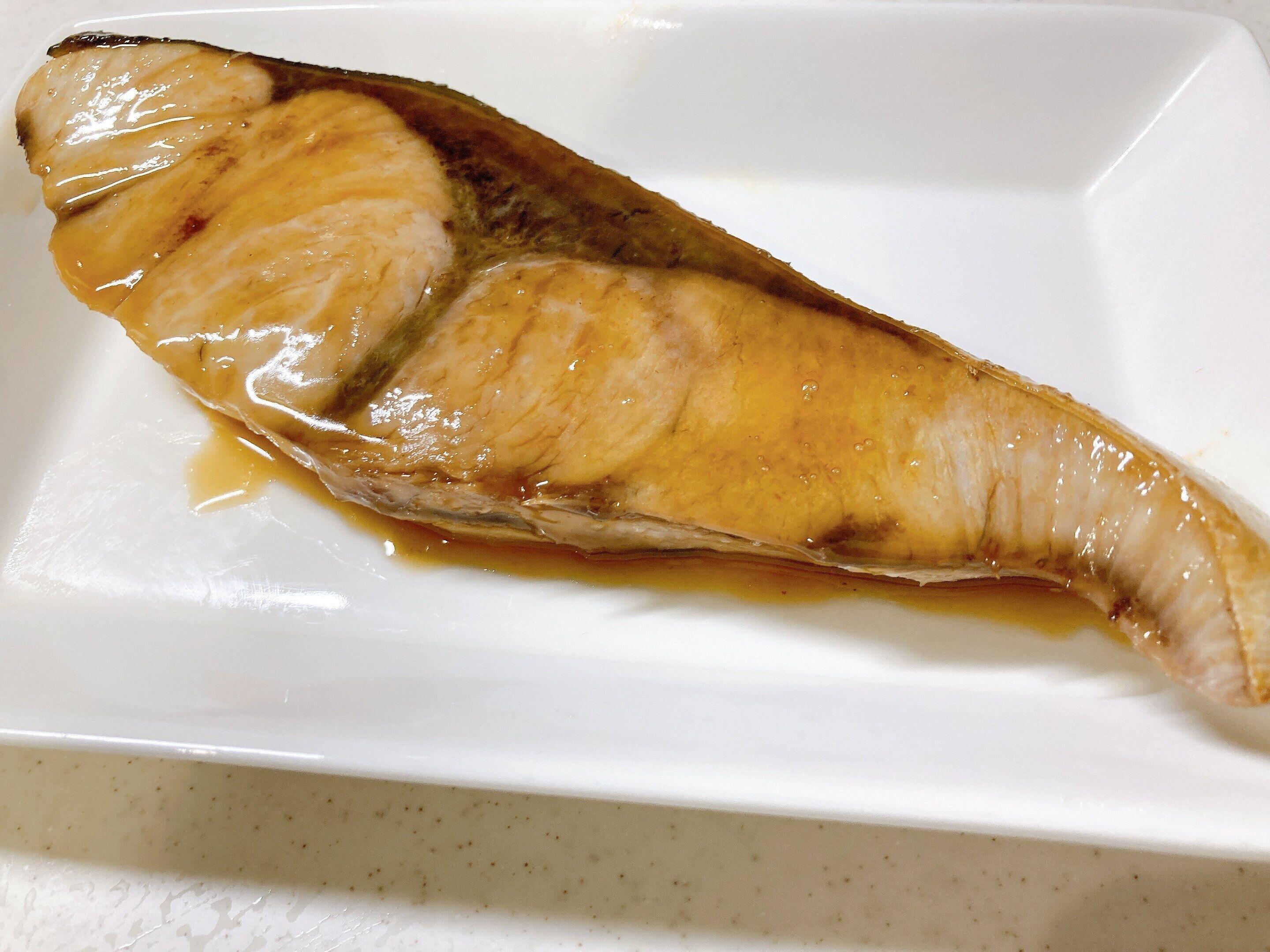 作り方は、ぶりの切り身の水分はキッチンペーパーなどでしっかり拭きとり、両面に薄く片栗粉をまぶします。フライパンに油をしき、ぶりを入れ両面焼き火がとおったら、ヨシダソースを入れます。(ハネるので火傷に注意してください)「ヨシダソース」は、ぶりの切り身1切れに対し、大さじ1杯程度使用しました。ソースが煮詰まり、とろみが出たらできあがり。
