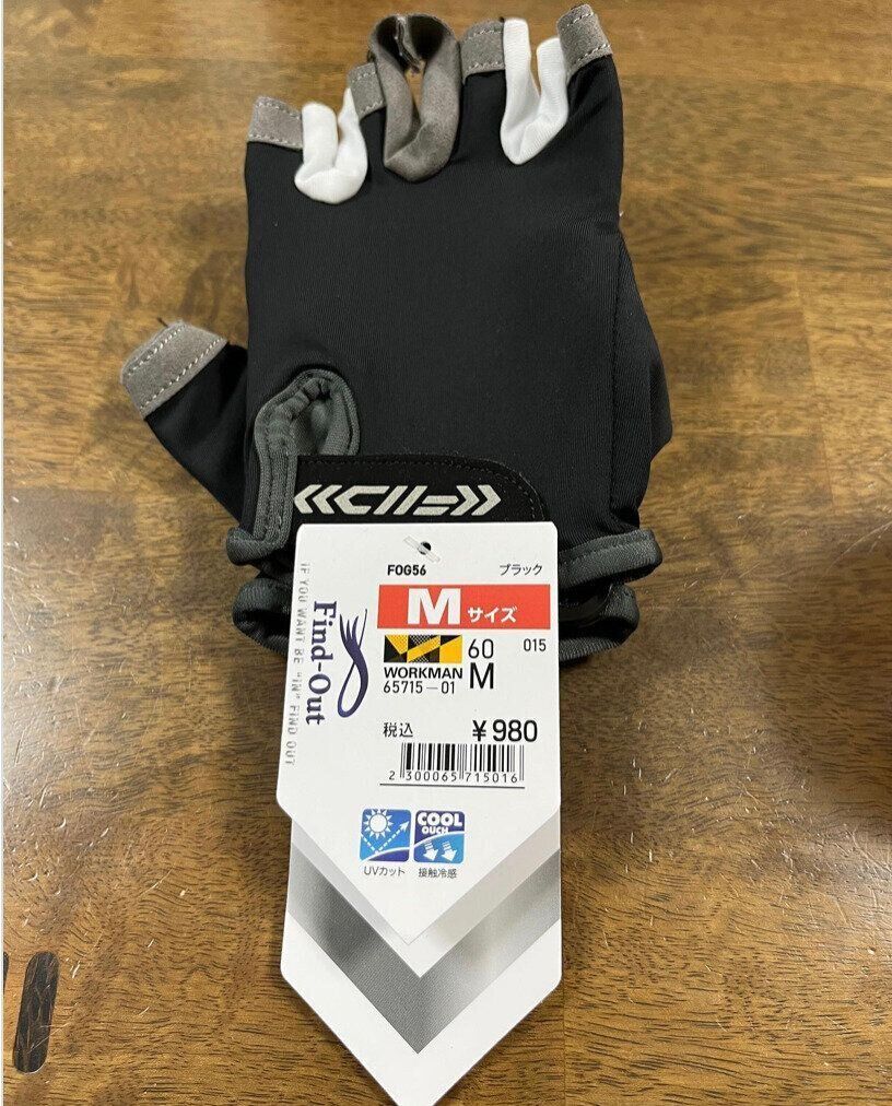 新商品のこちら、限定生産品の「冷感サイクルクッショングローブ」です。カラーは他にもあり、全部で3カラー展開。接触冷感とUVカットの生地を使用し、これからの季節にぴったりです。手のひらはクッション付きで使い心地も良好。指抜きループがついているので脱ぐのも簡単です。