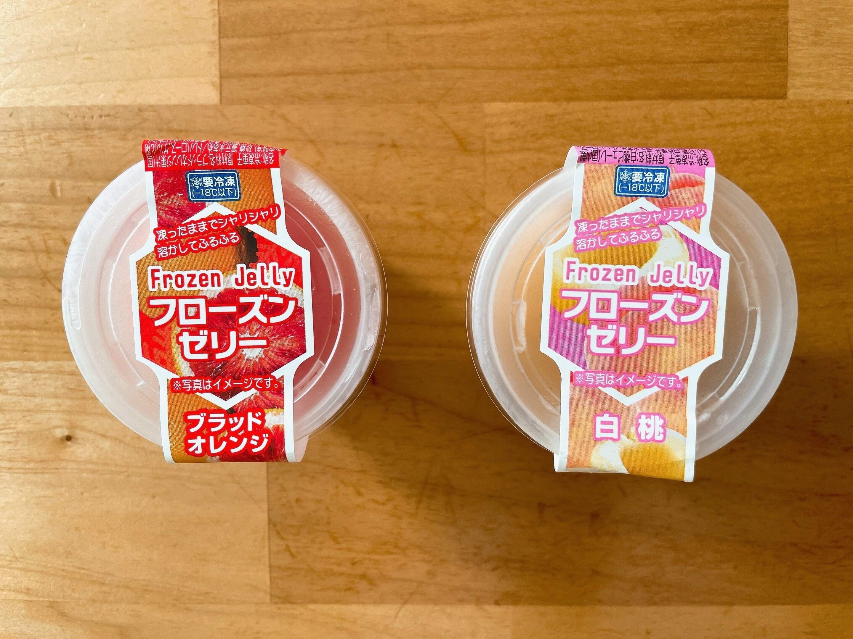 フローズンゼリーは、凍ったままでも溶かしてでも食べられるカップゼリーで、1つ86円。ぶどう、白桃、ブラッドオレンジが販売されています。