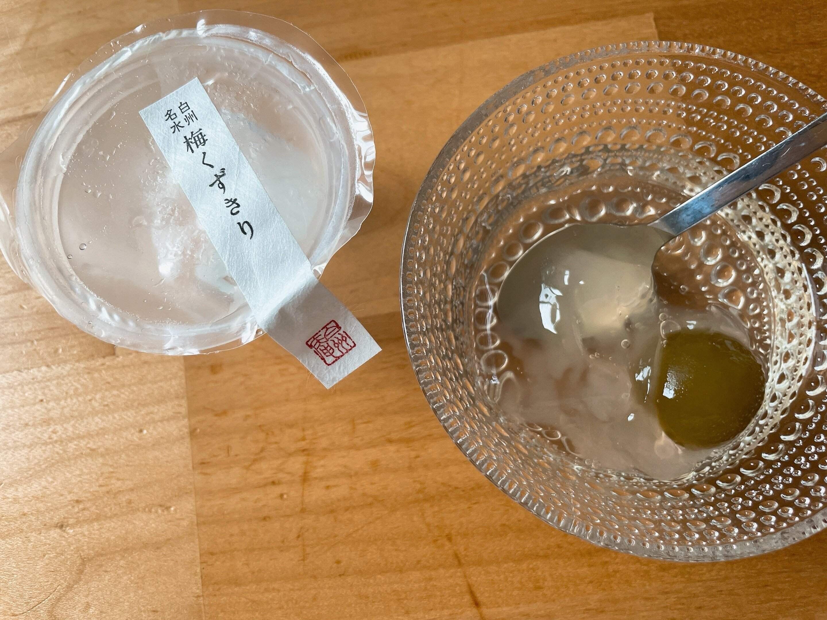 柔らかい梅ゼリーの中に、少し弾力のあるくずきりと梅の甘露煮が入っています。