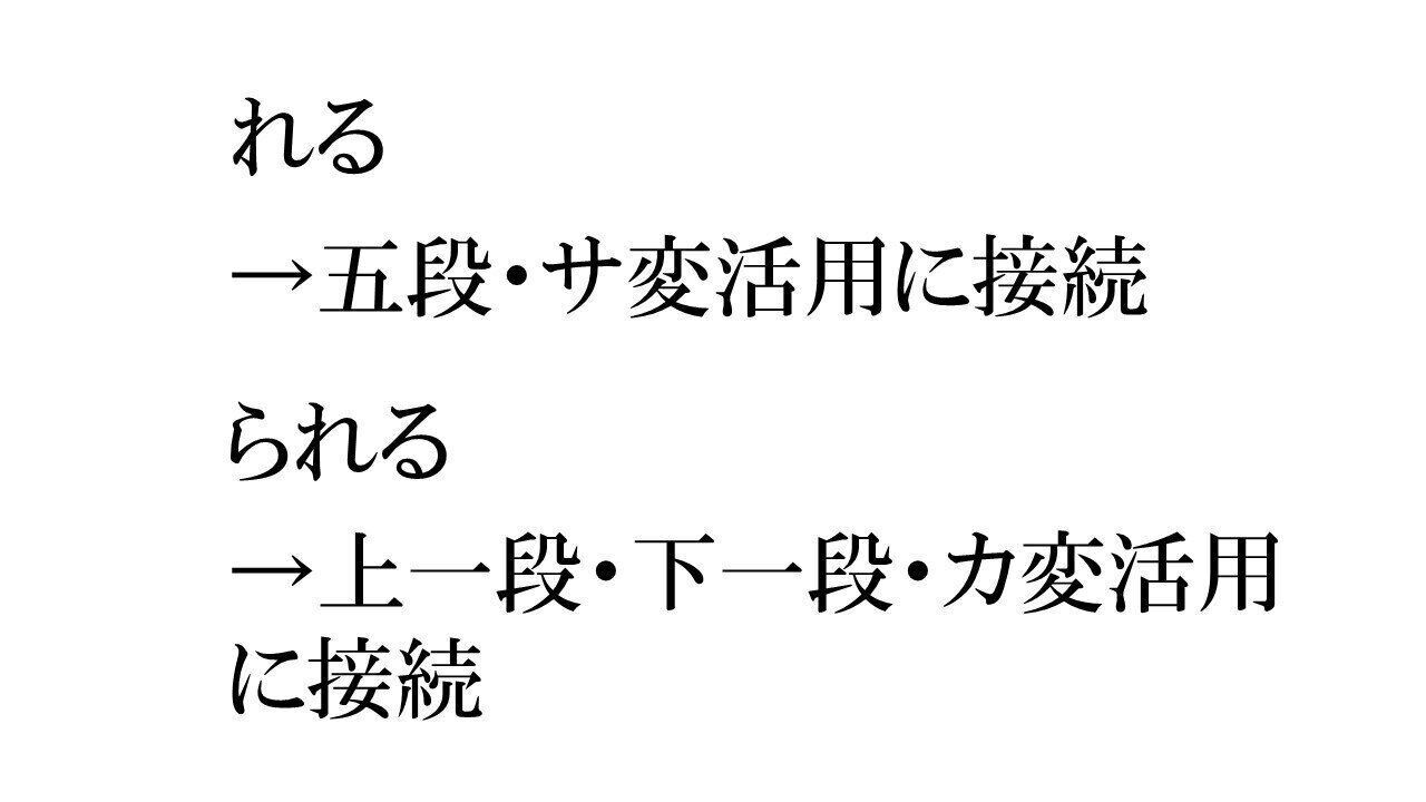助動詞「られる」がつく動詞は上一段活用、下一段活用、カ行変格活用の動詞の3種類。