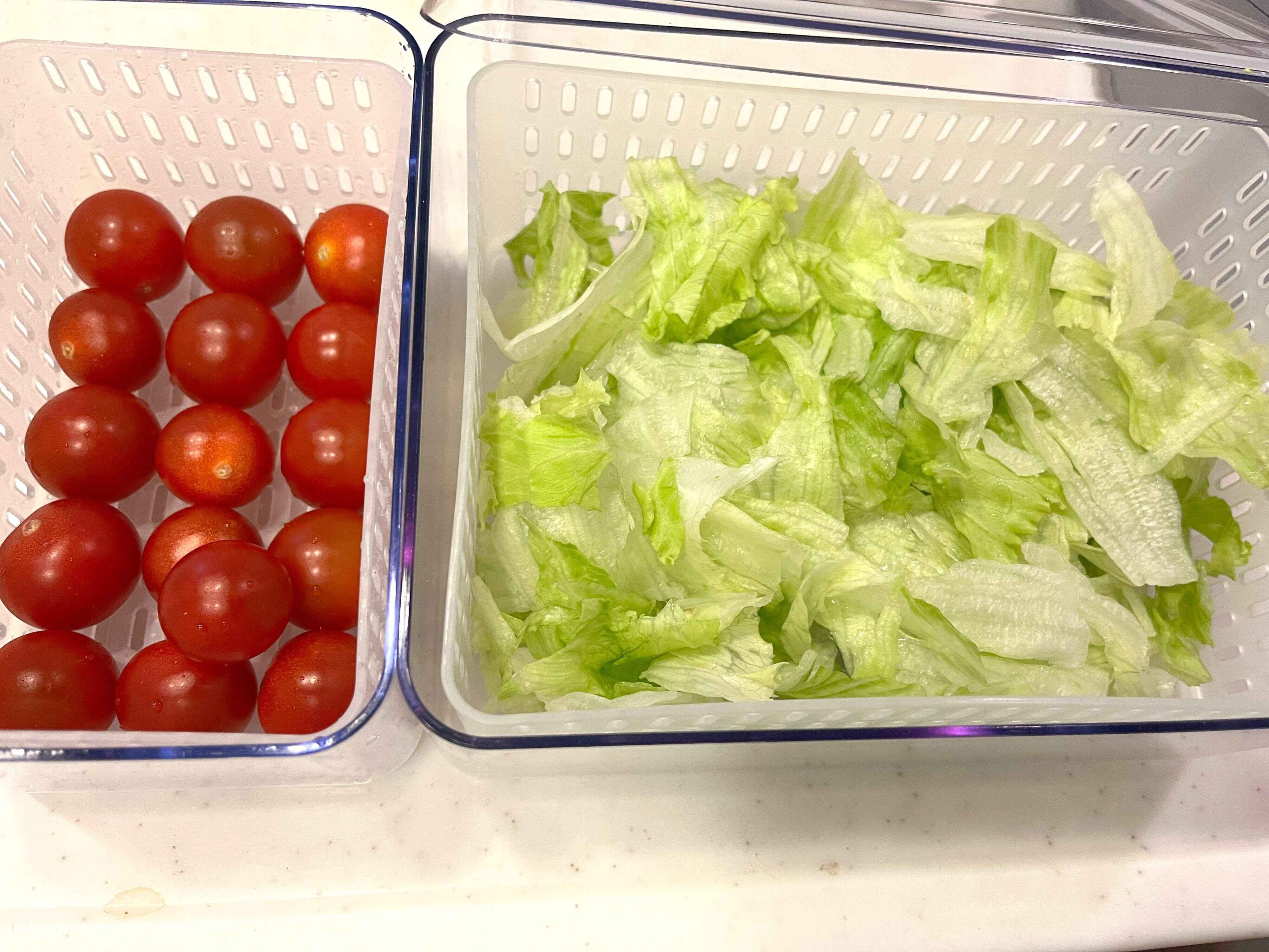 水分で傷んでしまう葉物野菜を使ったサラダは、今までは食べる時にカットして洗って盛りつけていました。