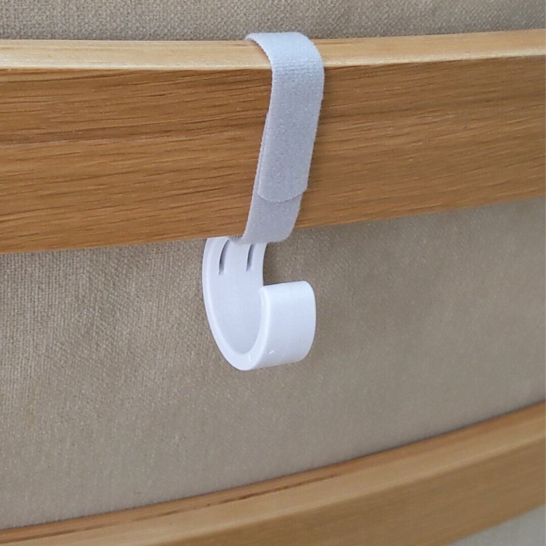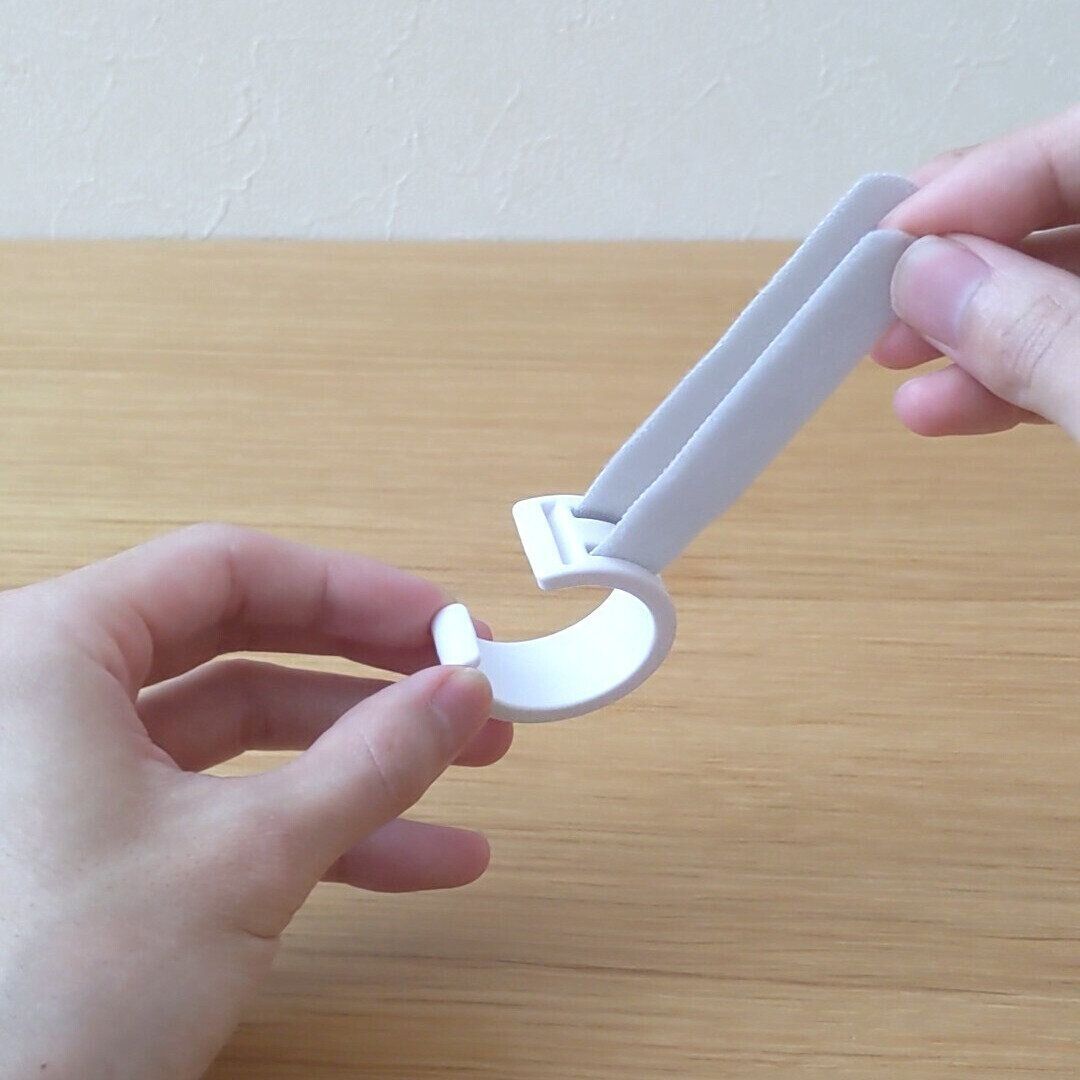 S字フックだと、ものを取り出したときにフックごと落ちてしまうことがありますが、このフックはベルトでしっかり固定できるので、落ちません!