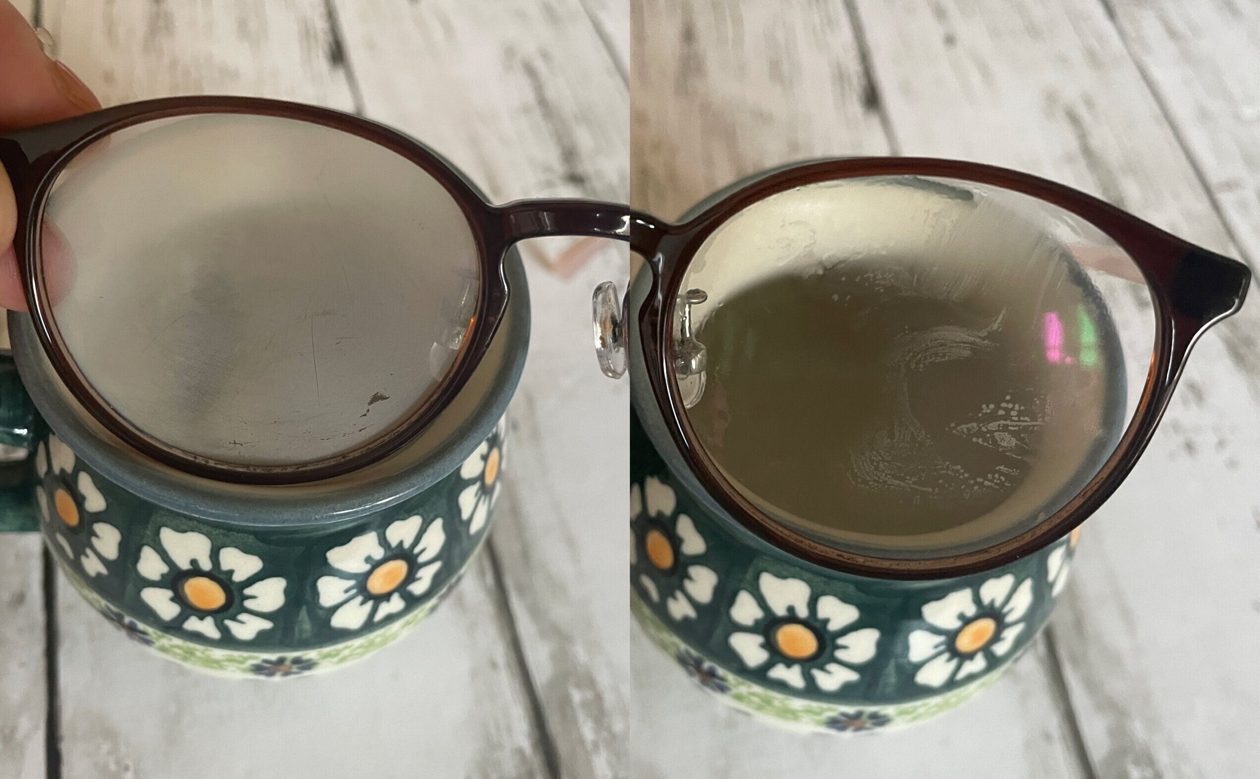 メガネ片側だけのレンズ両面に「メガネくもり止め液」を塗り、熱いお湯を入れたマグカップの上にかざしてみました。