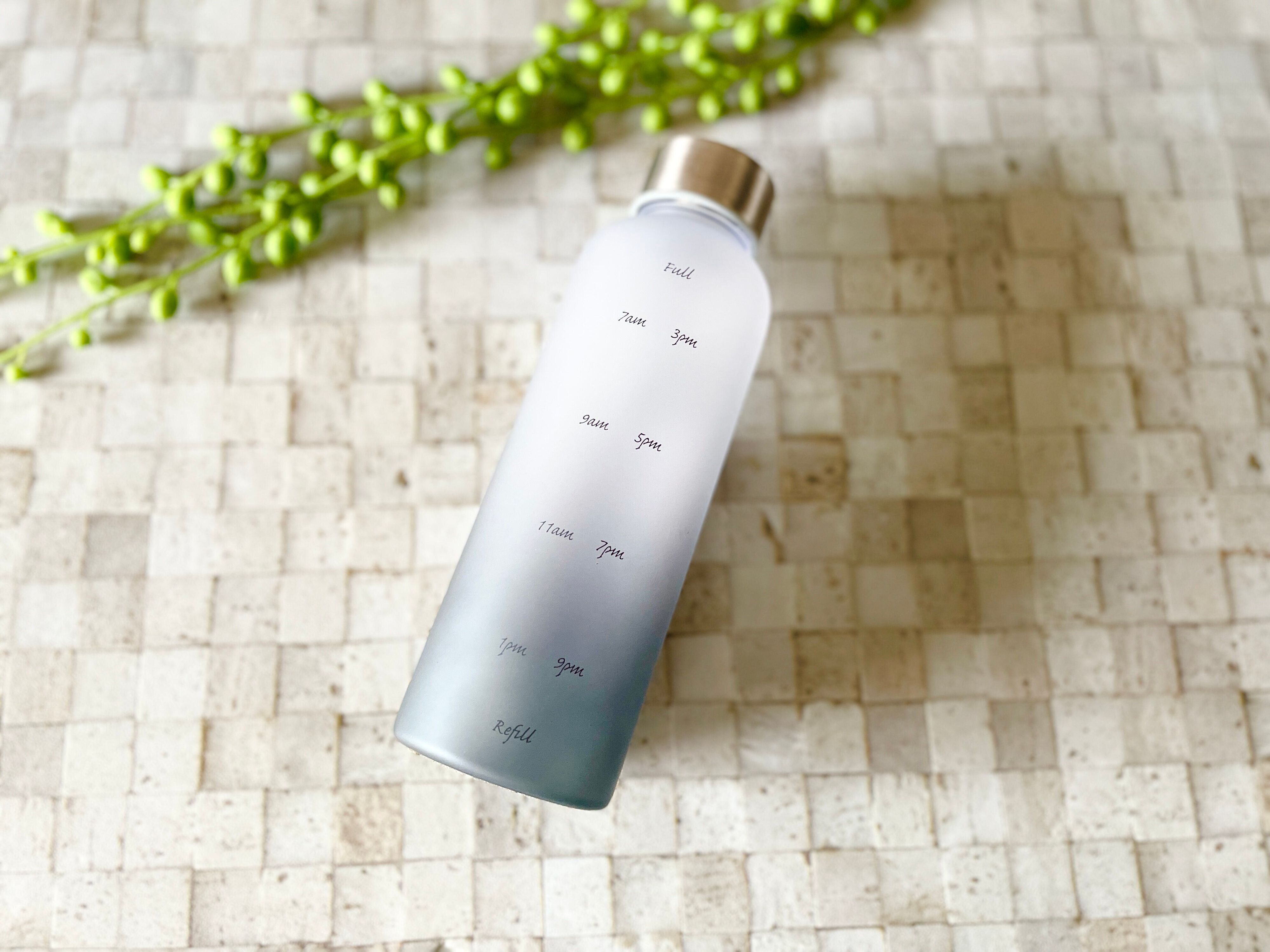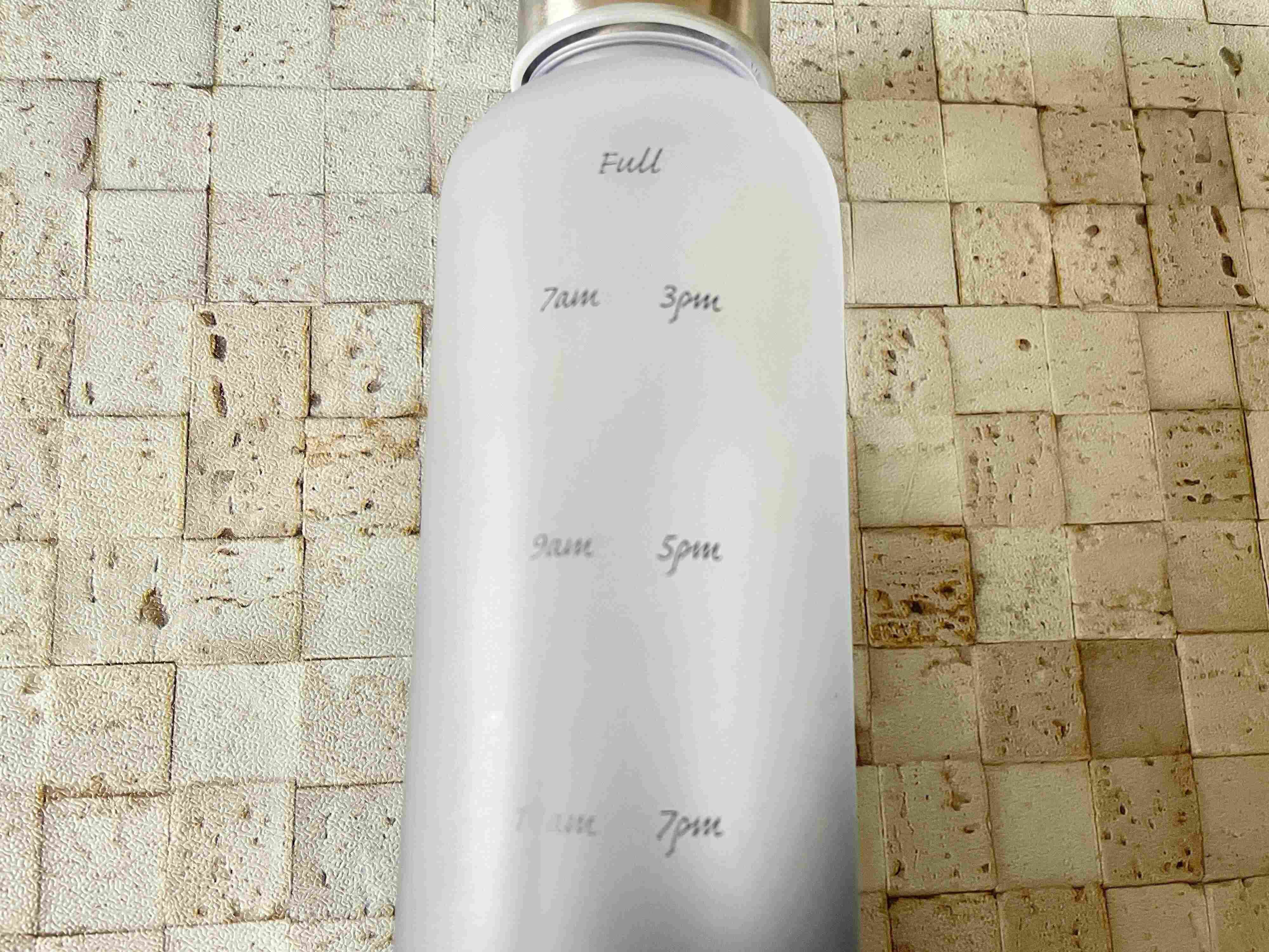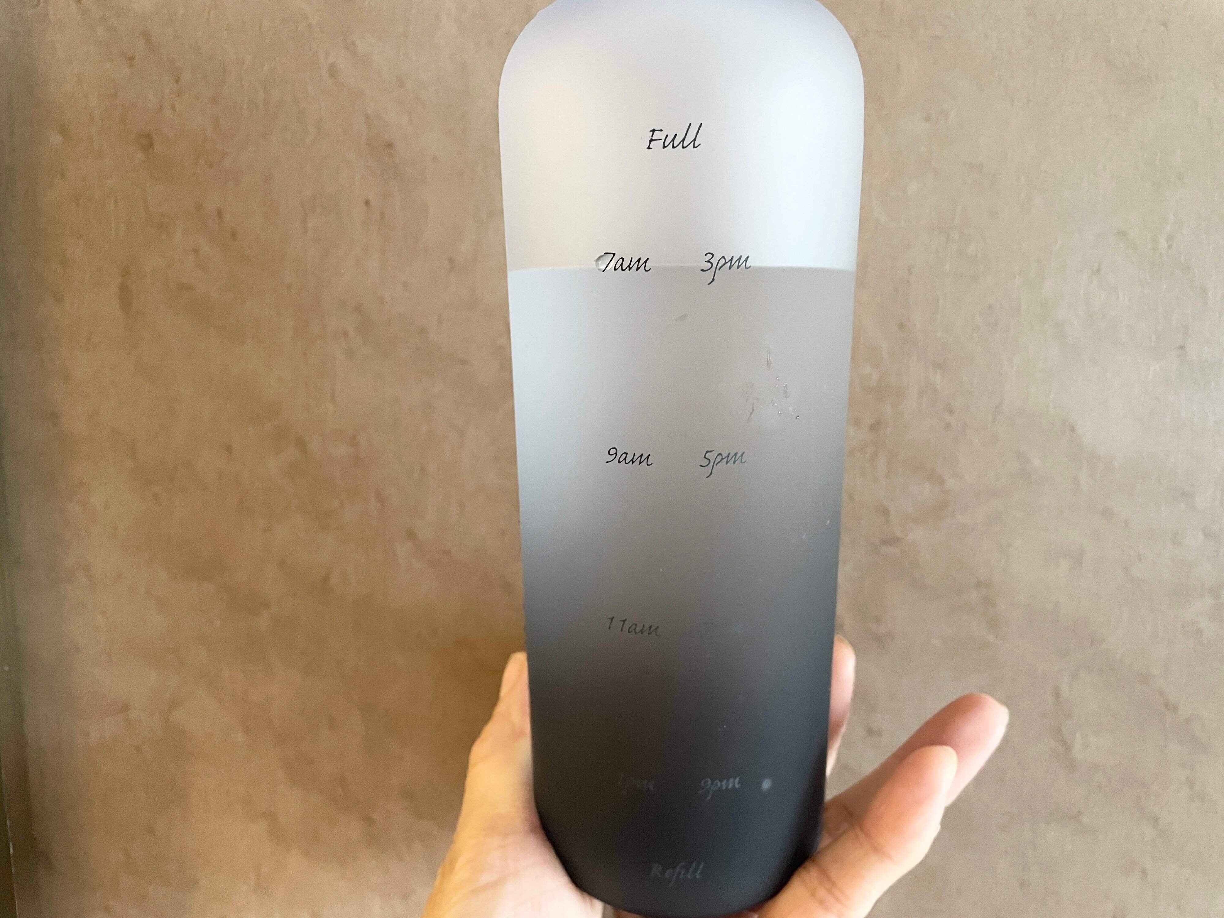 まずはFullまで水を入れ、午前7時、9時、11時、1時に飲み、空になったらまた入れて、午後も同じように飲めば1日で1リットルの水分をクリアできますよ。