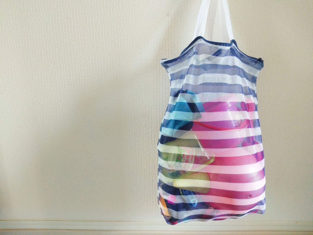 100円ショップでお砂場バッグとして売られているものは、お砂場で遊ぶ小物を入れるにはちょうどいい大きさですが、ボールまでは入りきらず、ボールだけ手で持つということがしょっちゅうでした。