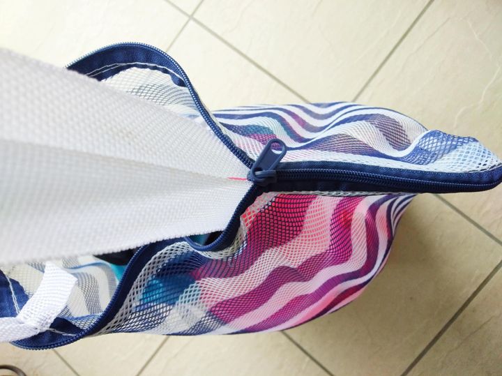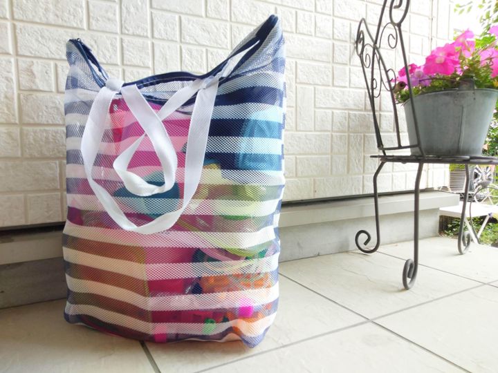 お砂場バッグの代わりに提案するのは、ダイソーの『そのまま洗える!トラベル収納トートバッグ』です。持ち手が付いた洗濯ネットのような作りで、旅行で使う洋服を入れたり、使った洋服はそのまま洗濯できたりと、本来は旅行で便利に使えるもの。