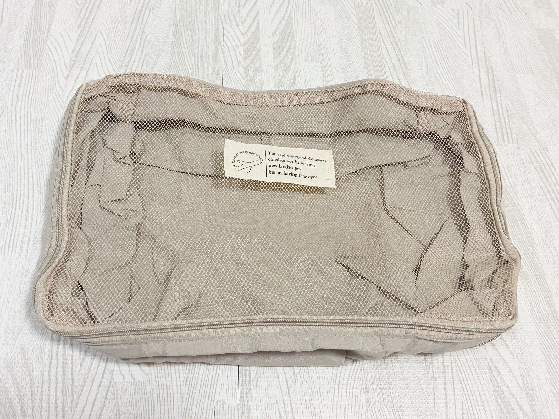 マニアが購入したJTB×3COINSコラボシリーズアイテム2つ目は「衣類圧縮バッグ:小サイズ」(330円)です。旅行のパッキングに欠かせない衣類圧縮バッグは筆者が購入したベージュの他にアイボリーもあります。かわいい飛行機のイラストが描かれたタグ付き。レディースMサイズの薄手のTシャツなら10枚・レディースMサイズのトレーナーなら3枚収納できるサイズ感で、チャックを閉める事で空気が抜けて衣類を圧縮してくれます。大サイズ(550円)もあり、大サイズなら冬物の衣類の収納にも便利です。