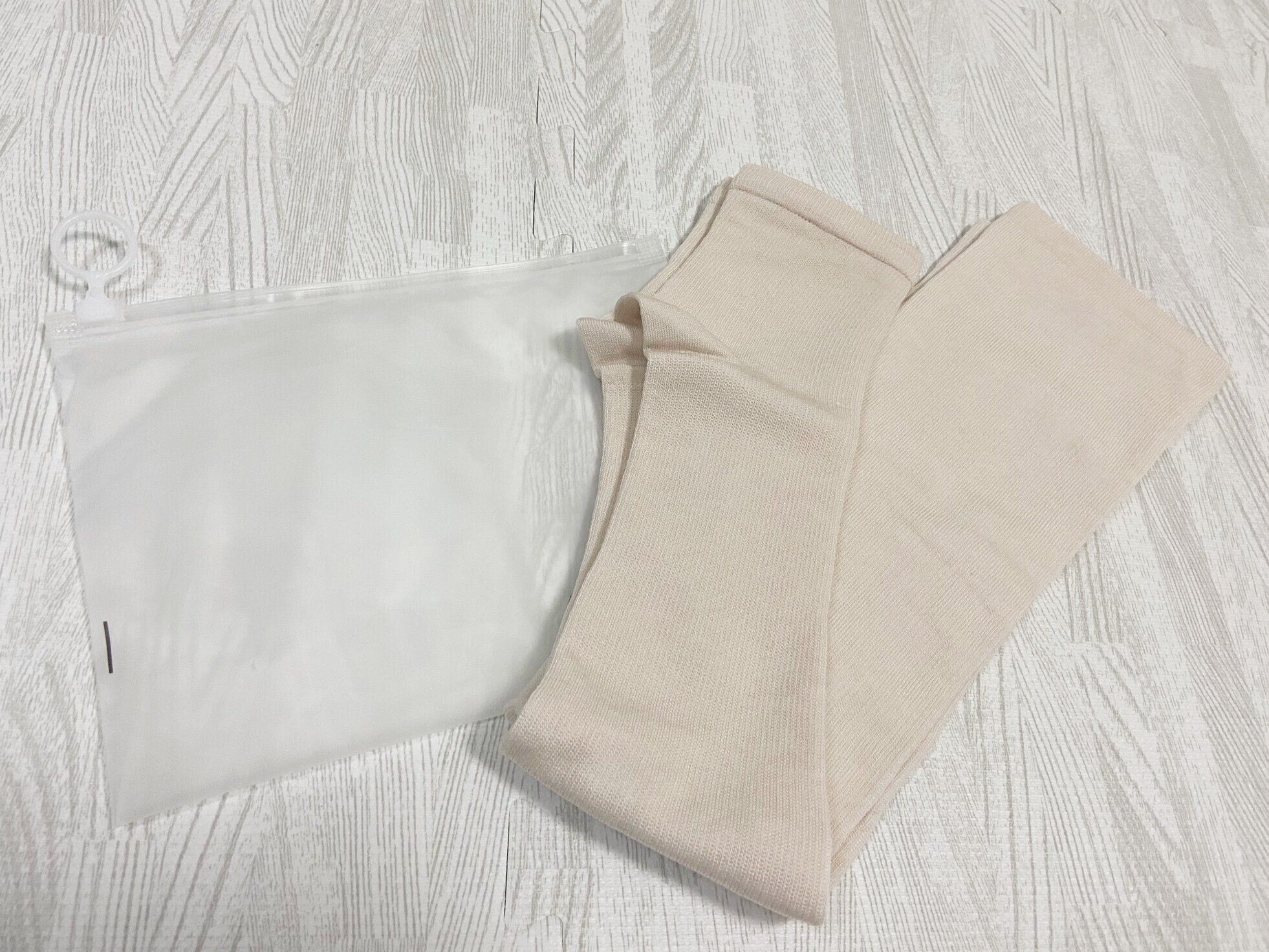 マニアが購入したJTB×3COINSコラボシリーズアイテム1つ目は「ポーチ付き着圧ソックス」(550円)です。カラーはベージュとブラックの2色展開で着用時はニーハイソックスくらいの丈感です。移動時など長時間乗り物に乗るときや、旅先の宿などでも使用できますし、私は日常でも足が疲れているなぁと感じるときにも使用しています。