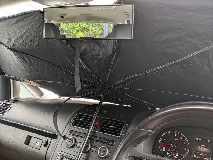 最近では100均やスリーコインズでも販売されている傘タイプのサンシェード。車をお使いの皆さんにぜひともオススメです。
