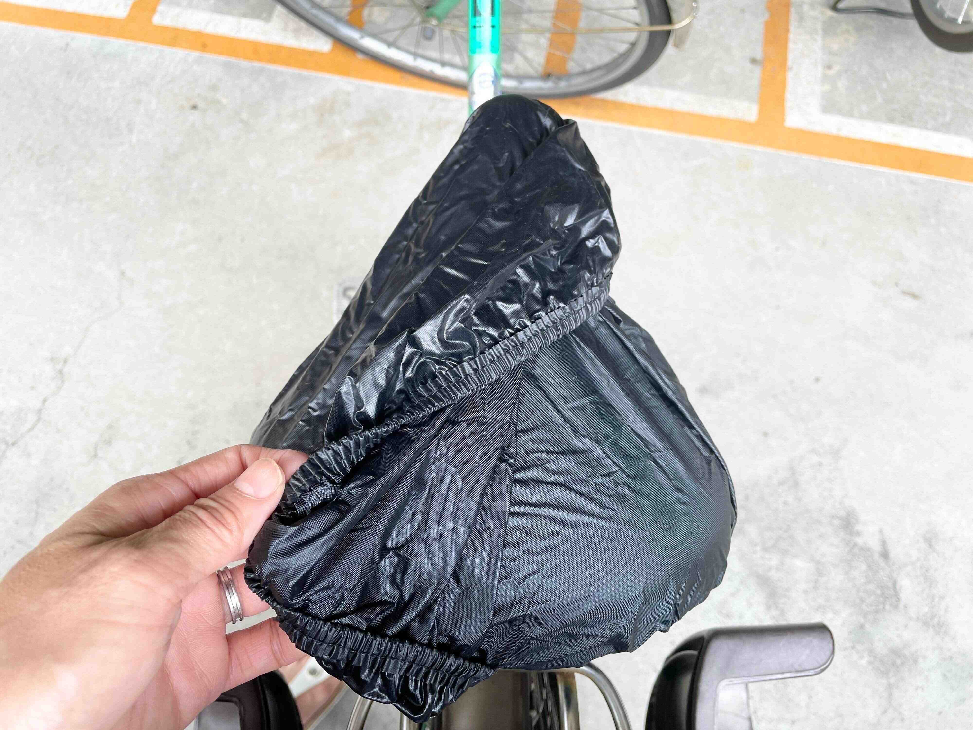 さっそく自転車のサドルに取りつけてためしてみました。ゴム入りでスポッと被せられるので装着は簡単です。