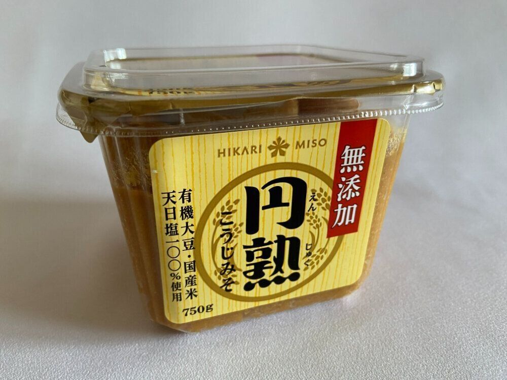 筆者が愛用しているのはひかり味噌「無添加円熟こうじみそ」。スーパーなどでは750g入りのものが販売されています。(購入時:413円)