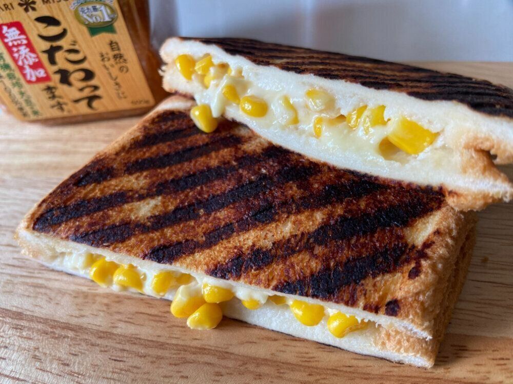 いつものホットサンドより焦げやすいので弱火でじっくり焼くのがポイント。焼けた味噌の香ばしい風味が甘いコーンとの相性抜群でとってもおいしいホットサンドです。