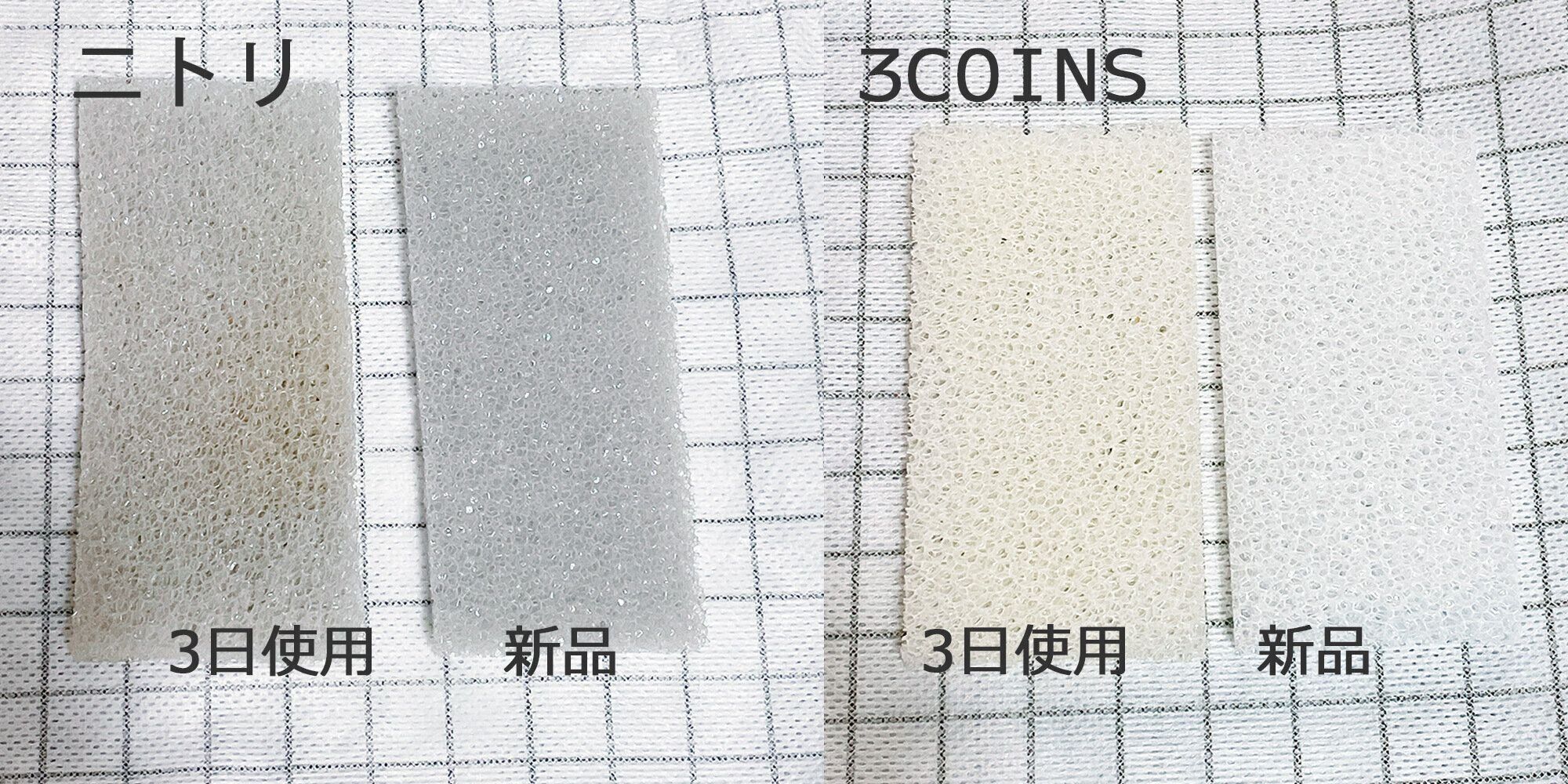 3COINSは変色はしているもののスポンジ自体はしっかりしていて、汚れがさほど気にならなければ1週間くらいなら使えそうな気がします。