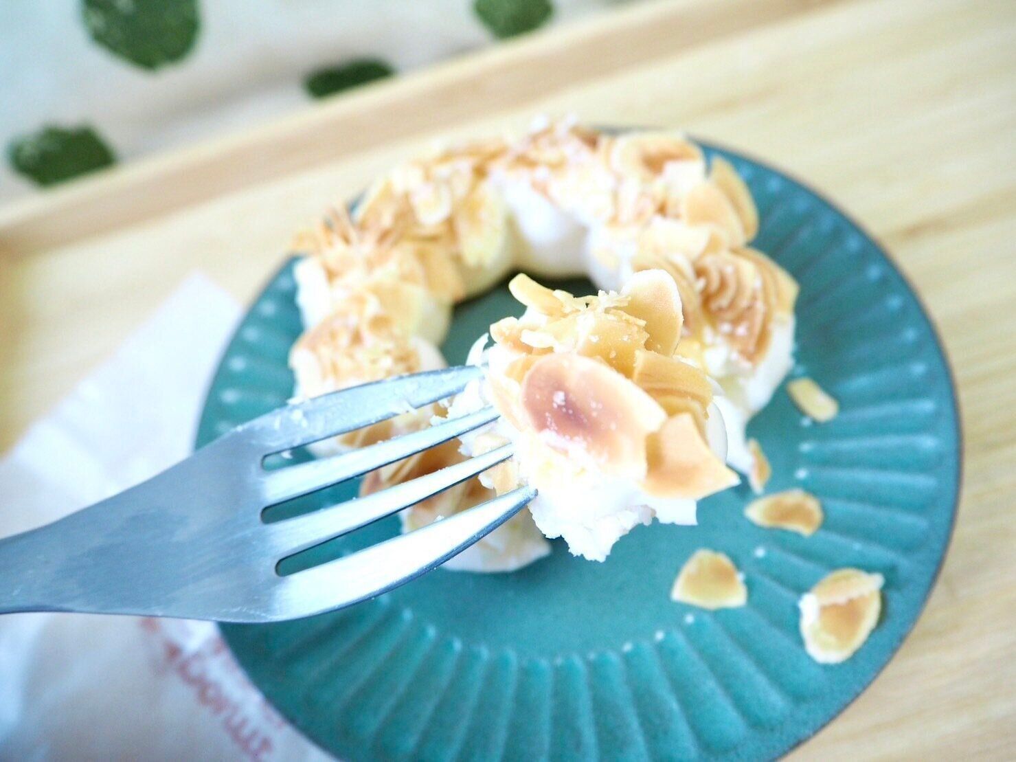 スライスアーモンドのパリパリ感、生地の柔らかさともちもち食感を全部同時に楽しめる贅沢さがあります。