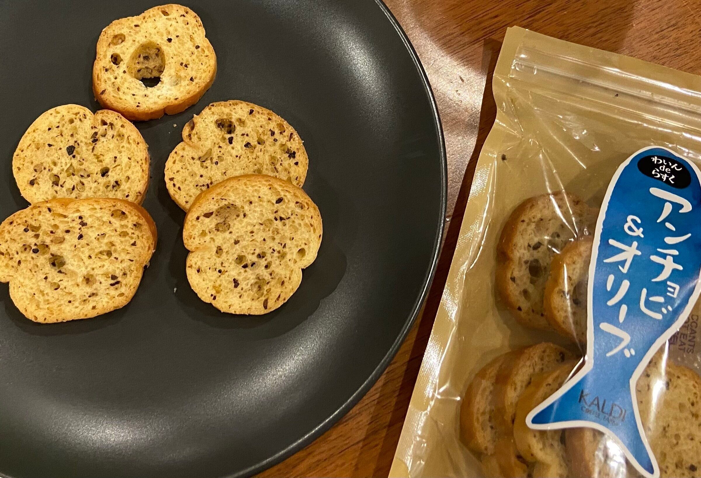ガーリック風味のラスクに、アンチョビのほどよい塩気とブラックオリーブ風味がおいしい。