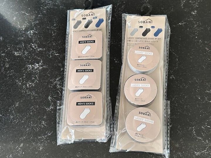 3COINSの防災アイテム、そばにある安心感『SOBANI』シリーズの圧縮ショート丈ソックス3足セットです。価格は330円。レディース(サイズ:23~25cm)とメンズ(サイズ:25~27cm)の販売がありますよ。