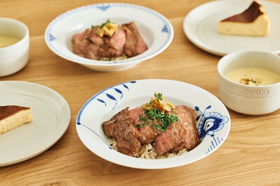 この日はガーリックライスのステーキ丼にコーンスープ。ゆり子さんのリクエストにより、チーズケーキも並んでいました。