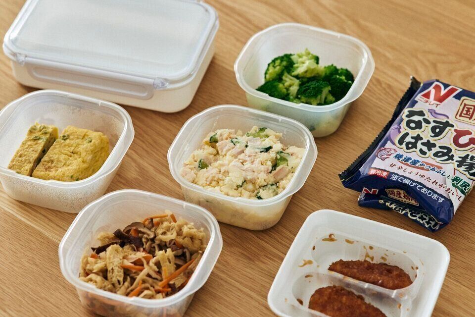 メインは冷凍食品を活用しつつ、作り置きのお惣菜を盛りつけると…。