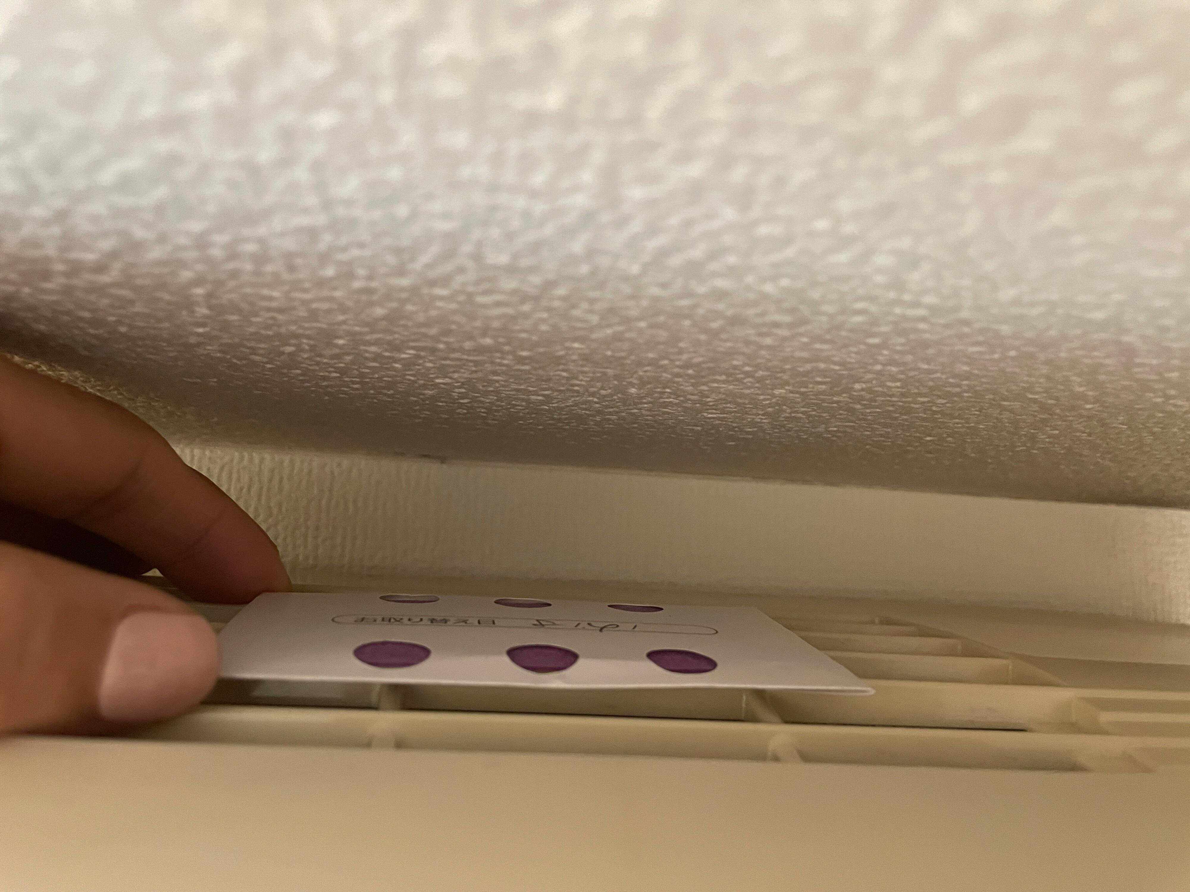 貼りつける場所は、エアコンの吸気口部分です。正面部分ではなく上の部分ですね。ふだんは見えない場所なので、貼っていることがわからないのもいいですよ。