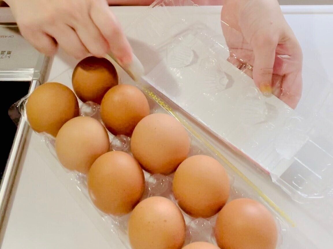 ドアポケットに卵ケースが付いている冷蔵庫もありますが、ドアの開閉で温度が上がりやすいので、あまりおすすめしません。この状態だと、冷蔵庫の棚にそのまま置けるので便利です。