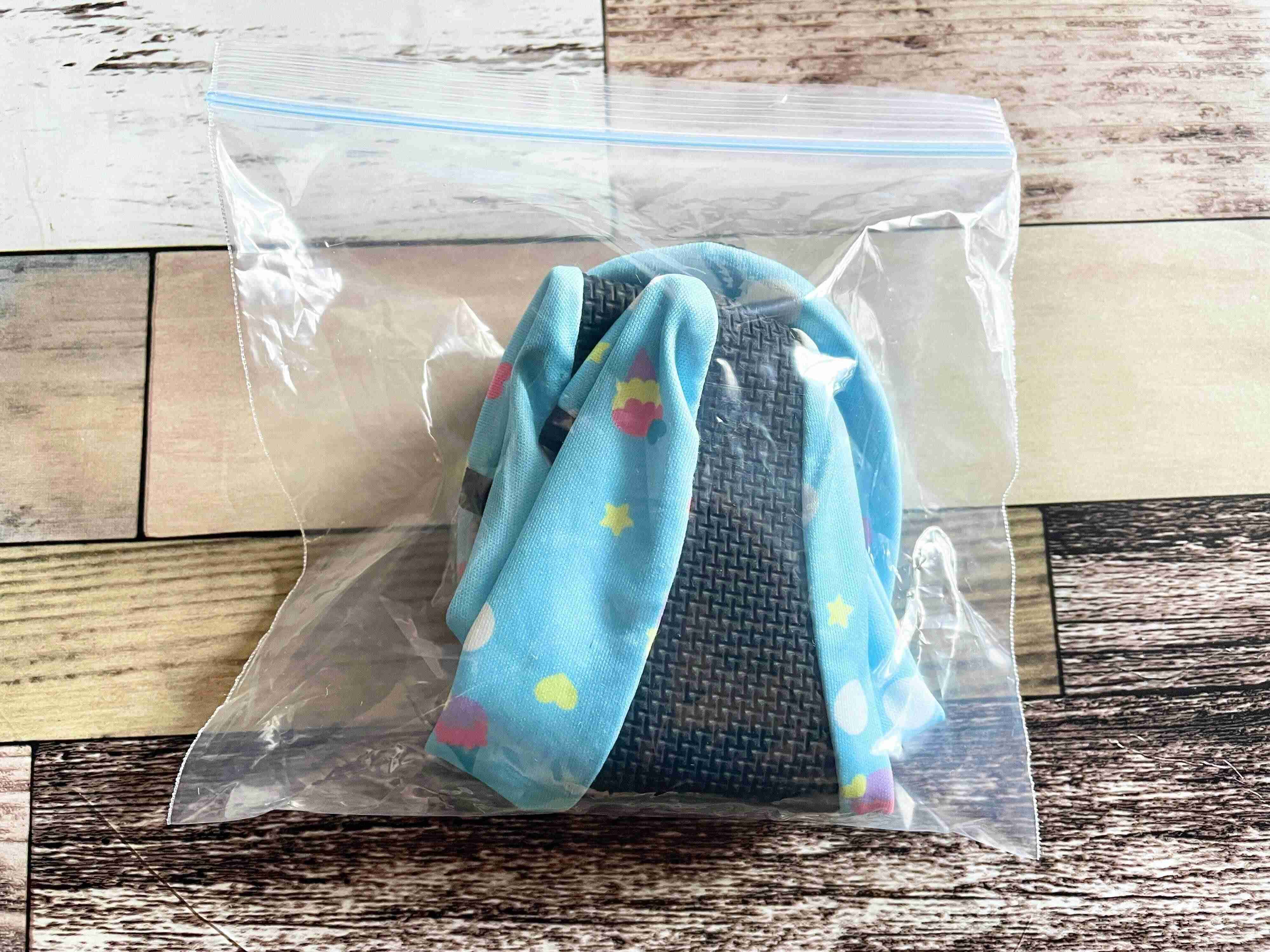 二つ折りにすると、ダイソーの「チャック付きストックバッグ」Sサイズ(14×16cm)に入る大きさです。