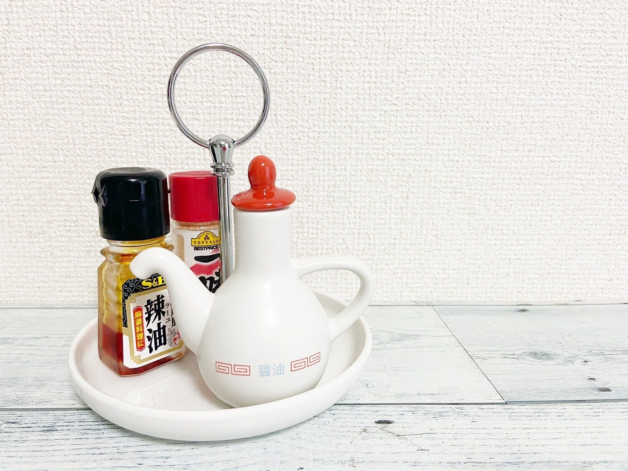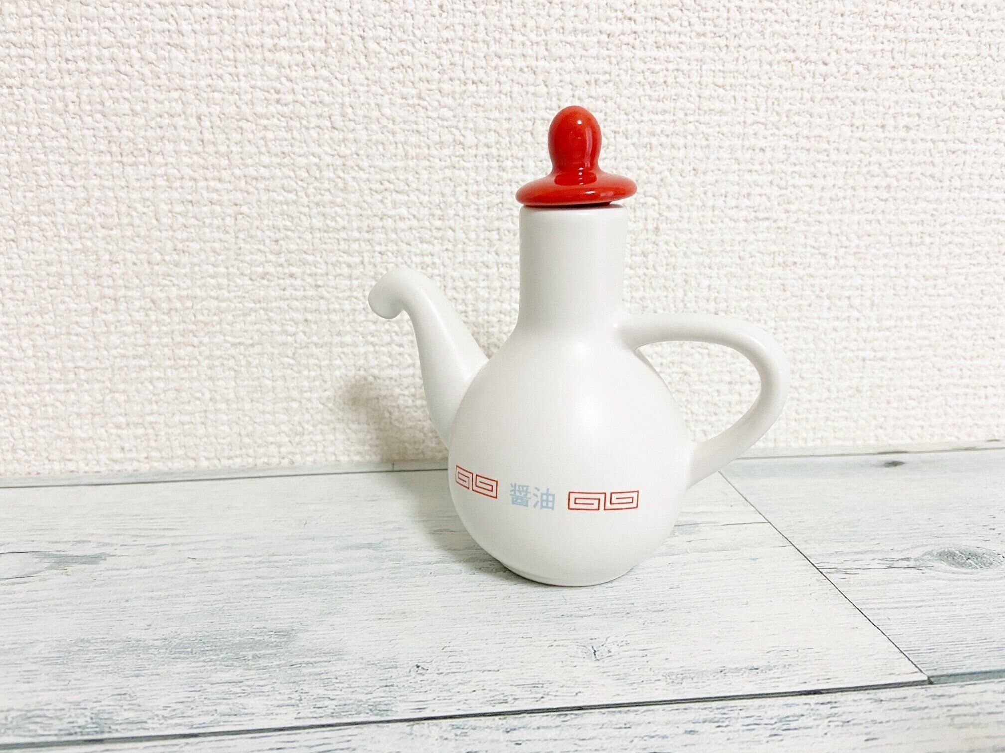 購入品1品目は、中華食器の定番な模様をオシャレにアレンジしたNEO中華感満載の「調味料入れ」(330円)。醤油の他に、酢・辣油とプリントされているデザインもあります。3つ揃えるとよりオシャレなのですが、今回は醤油デザインのみ購入しました。1つでも町中華っぽさをしっかりアピールしているカワイイルックスがお気に入りです。