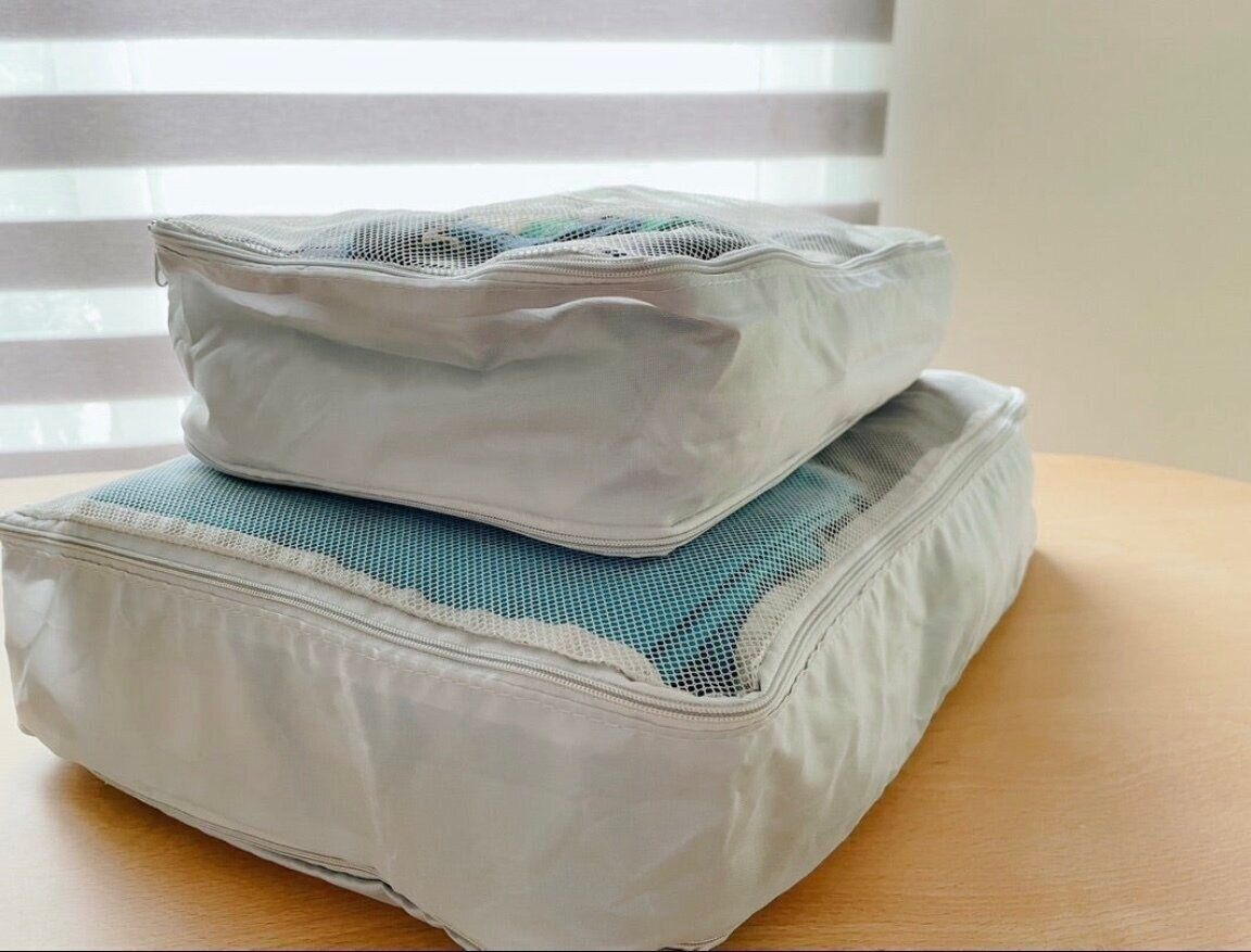 衣類圧縮はできないですが、片面がメッシュで通気性がよく中身が見えて探し物がないのは同じ。取っ手もあるので持ち運びも便利。3サイズのセットなので消耗品、お風呂セット、衣類というようにきれいに仕分けることができるので、旅行準備も片づけも楽ちんです。
