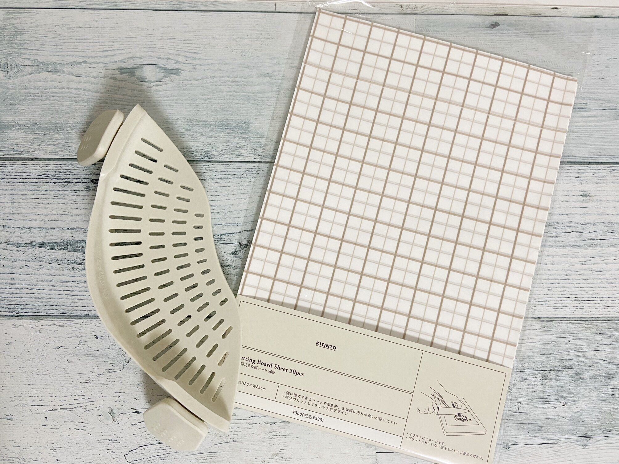 「【KITINTO】汚れ防止まな板シート:50枚入り」(330円)はリニューアルした大ヒットアイテム。旧タイプから常に自宅にストックしている3COINSマニア主婦がデイリー使いしているキッチンアイテムです。
