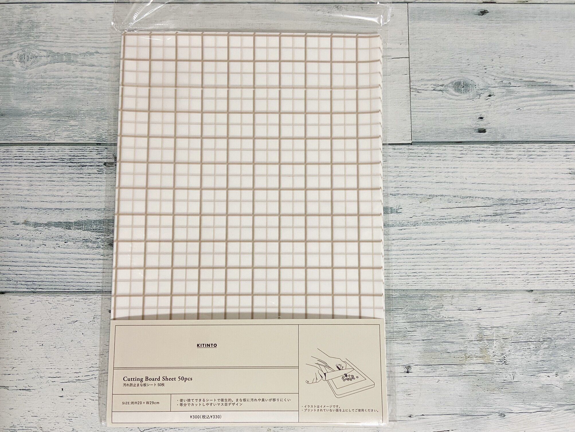 プリントされていない面を上にしてまな板の上にシートをセットし、その上で食材をカットすることでまな板の汚れを最小限に抑えることが出来る「【KITINTO】汚れ防止まな板シート:50枚入り」。前のデザインはおしゃれな葉っぱのような線画だったのですが、等分でカットしやすいマス目のデザインにリニューアル。さらに便利に進化しています。