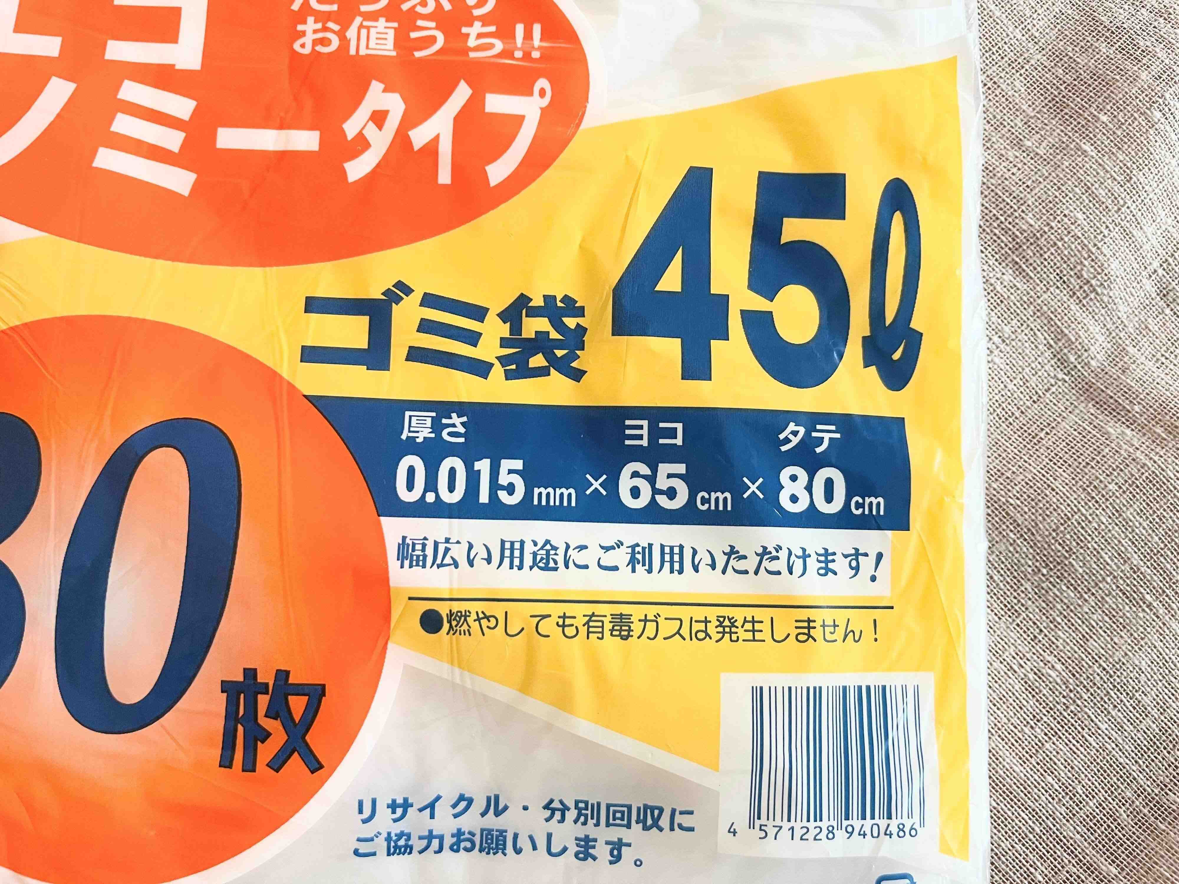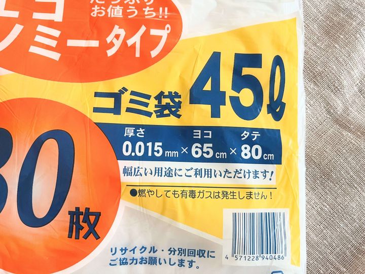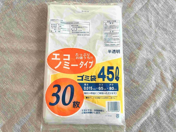 はじめにご紹介するのが取っ手のないゴミ袋。45Lサイズで、半透明タイプとなっています。容量はたっぷり30枚入り!