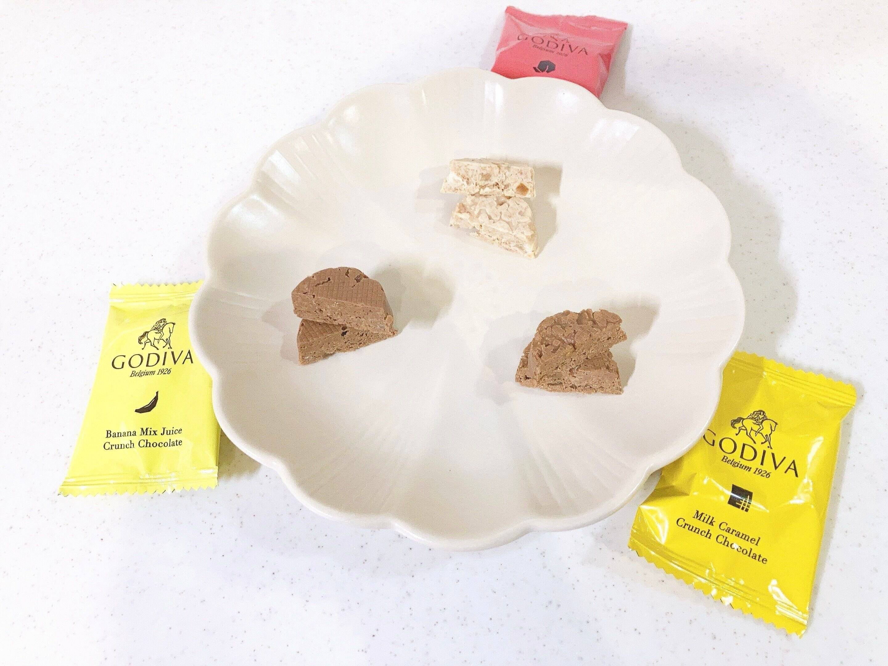 ピーチミックスジュース、バナナミックスジュースは中にドライりんご、オレンジピールが入っており果物感をしっかり感じられます。もちろんチョコはゴディバなので、おいしいですしクランチもザクザクで歯応えもいい商品です。