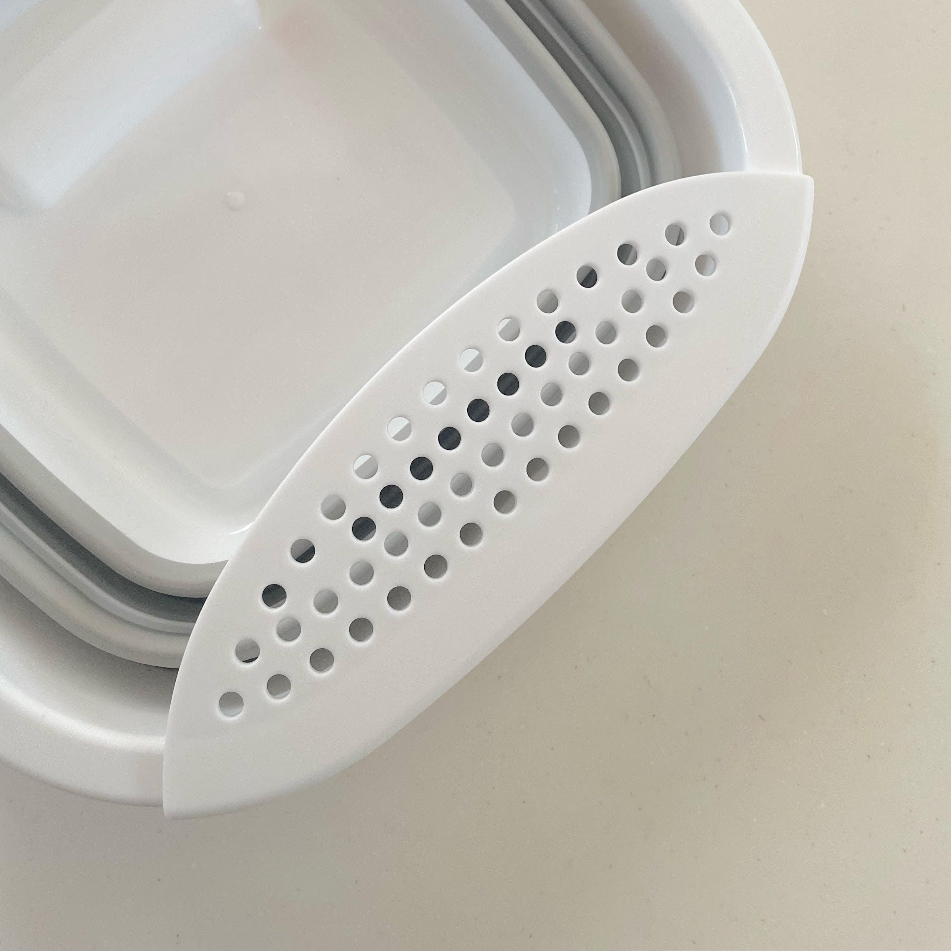 こちらが購入した折りたたみバケツで、以前のものと同じホワイトとグレーの配色。