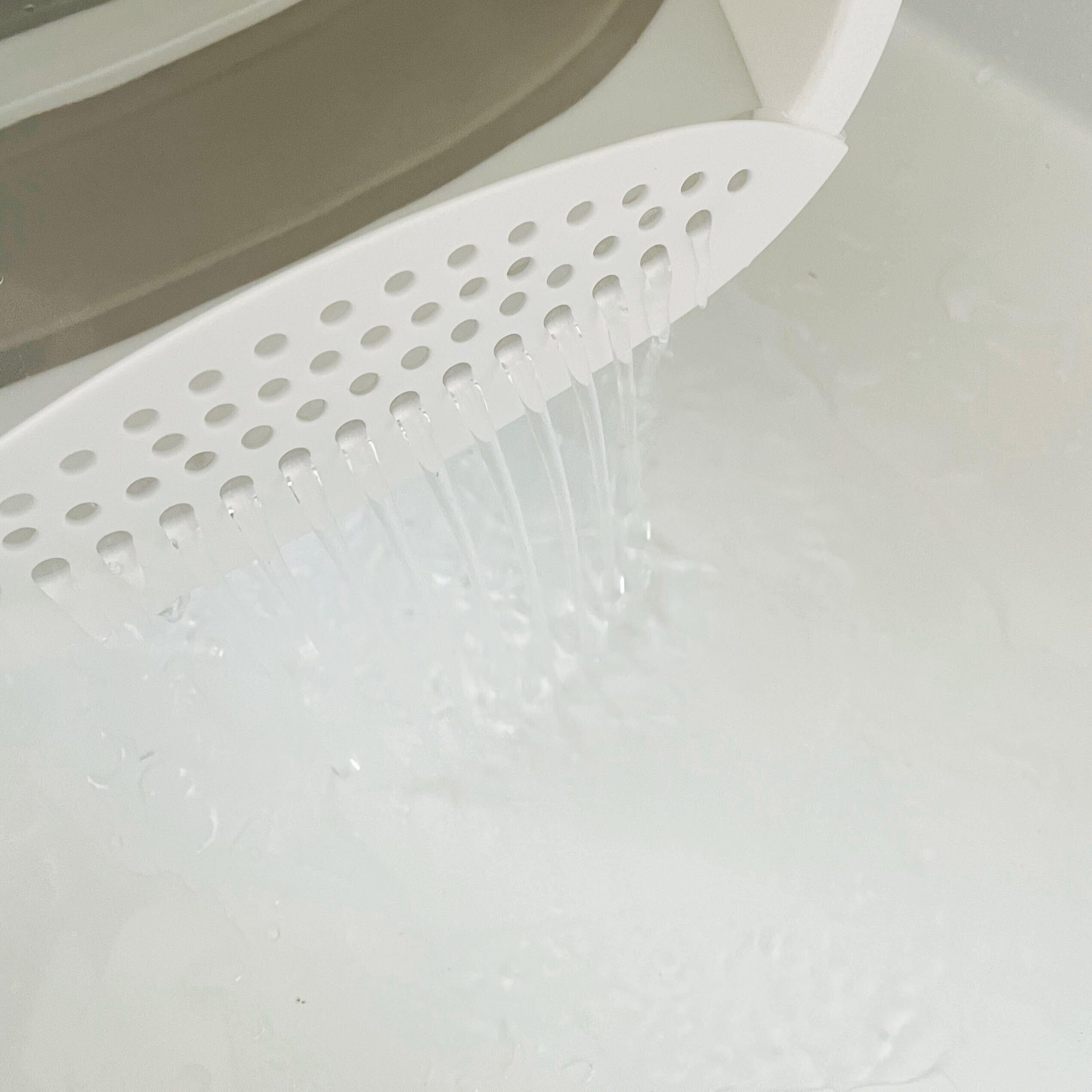 大きさが一回り小さくなって水切りパーツがついた、ダイソーの折りたたみバケツ。