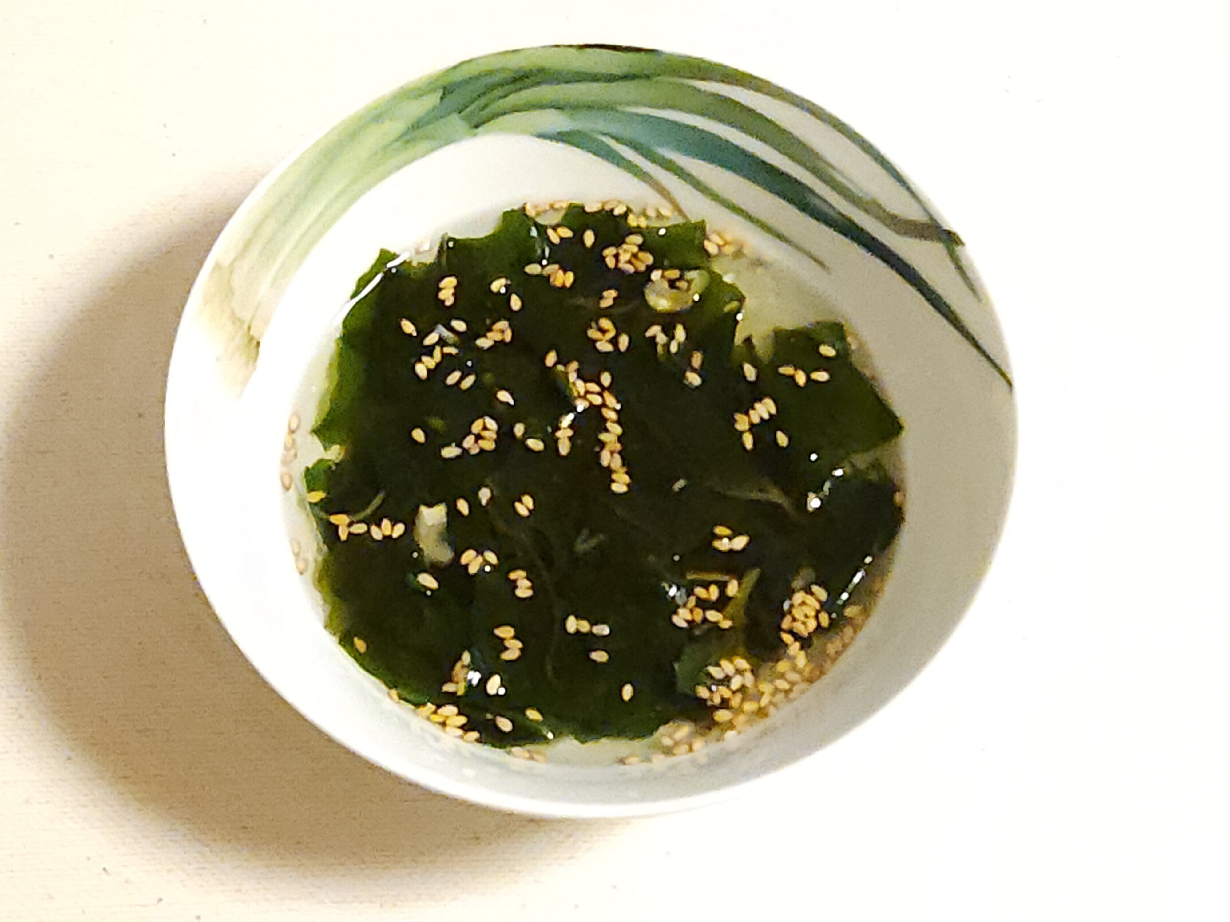 和風のスープではありますが、調味料にチキンエキスも使用しているので、ちょっとしたアレンジで中華風にもなります。写真は熱湯を注いだ後にごま油少々と白いりごま適量を加えて混ぜた中華風海藻スープです。