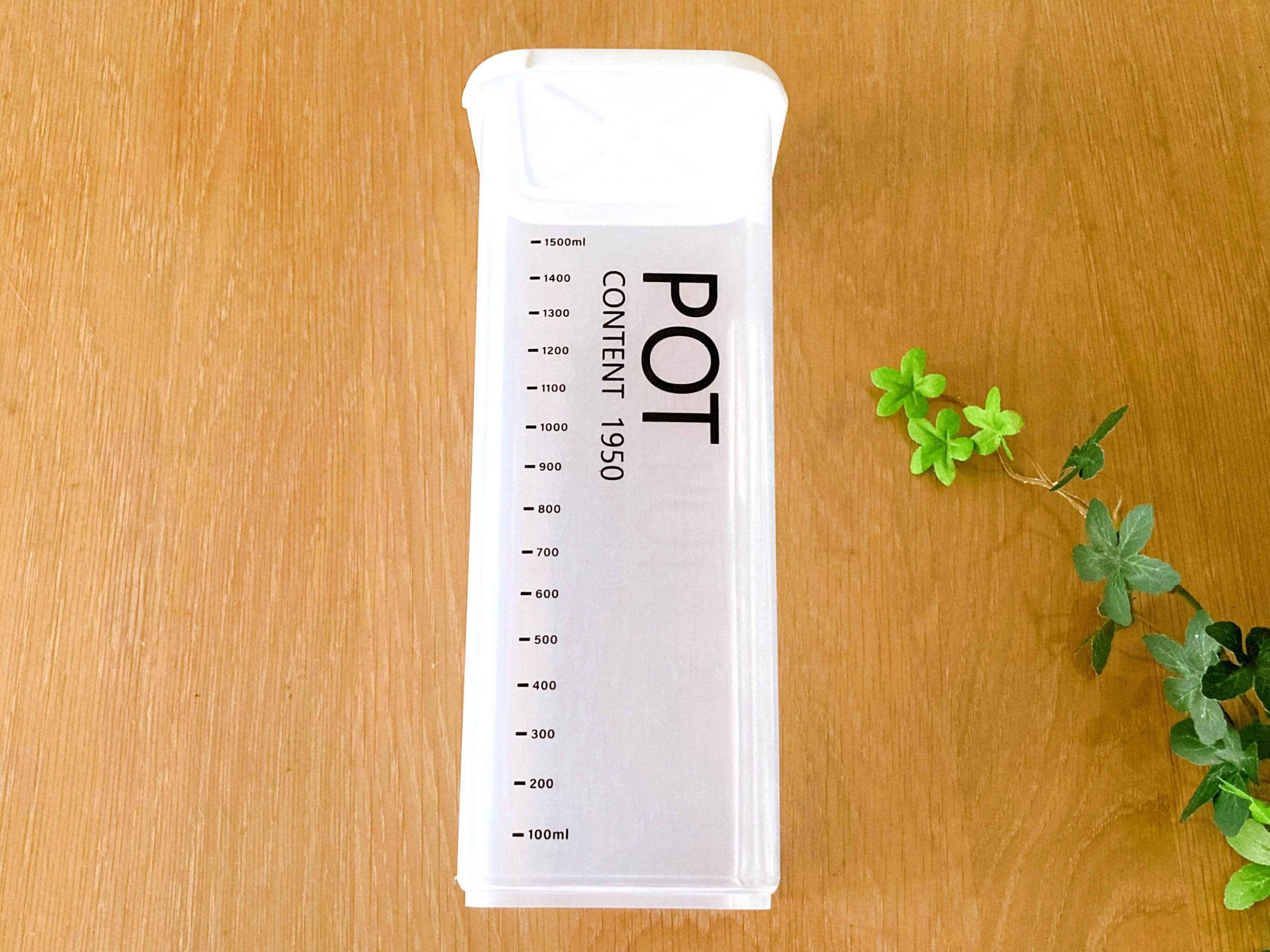 他ではあまり見ない背の高い「食品保存容器」 容量は1.95Lで価格は220円。
