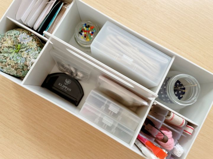 2つ目は裁縫ボックスとして使っています。しょっちゅう使うものではありませんが、ときどき綻びを縫う必要が発生することがあります。そんなとき、すぐに手に取れないと裁縫不得手な私はいつまでも手が出せなくなってしまうので、フタなしのキャリーボックスを使用。今は小3の子どもたちも使いたいときに持ち出して便利に使っています。