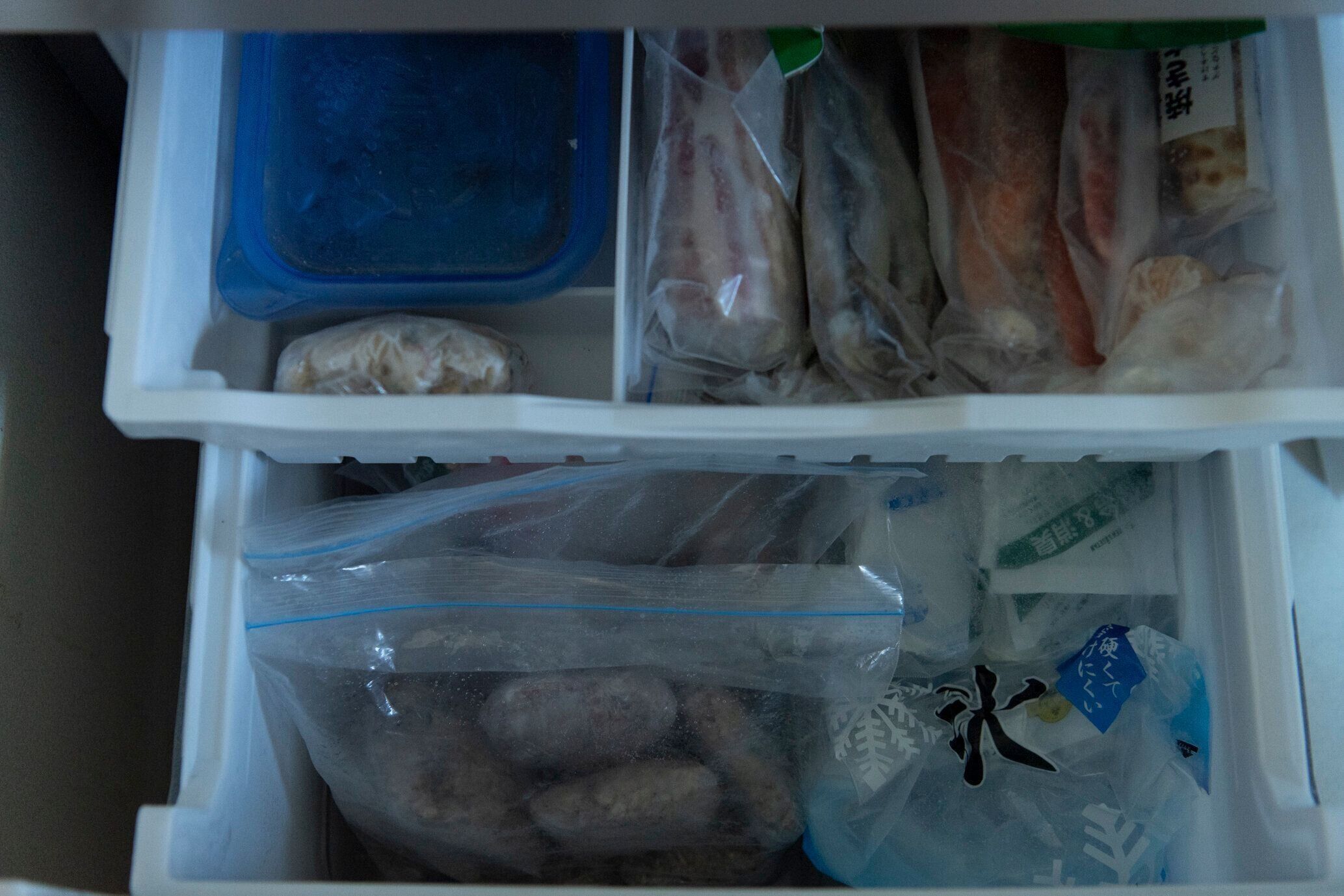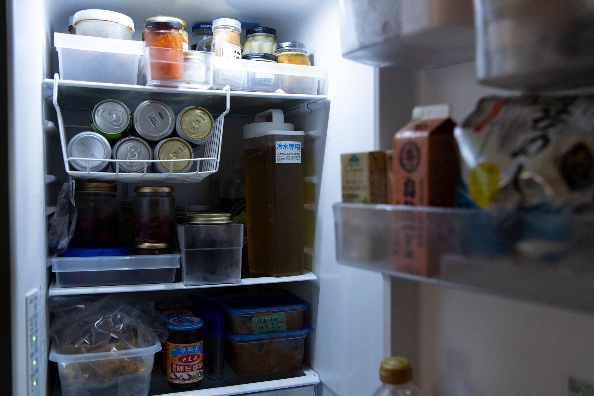 仕事用の冷蔵室をほぼ占領しているのは、調味料類。仕事柄各国の料理を作るので常備しています。