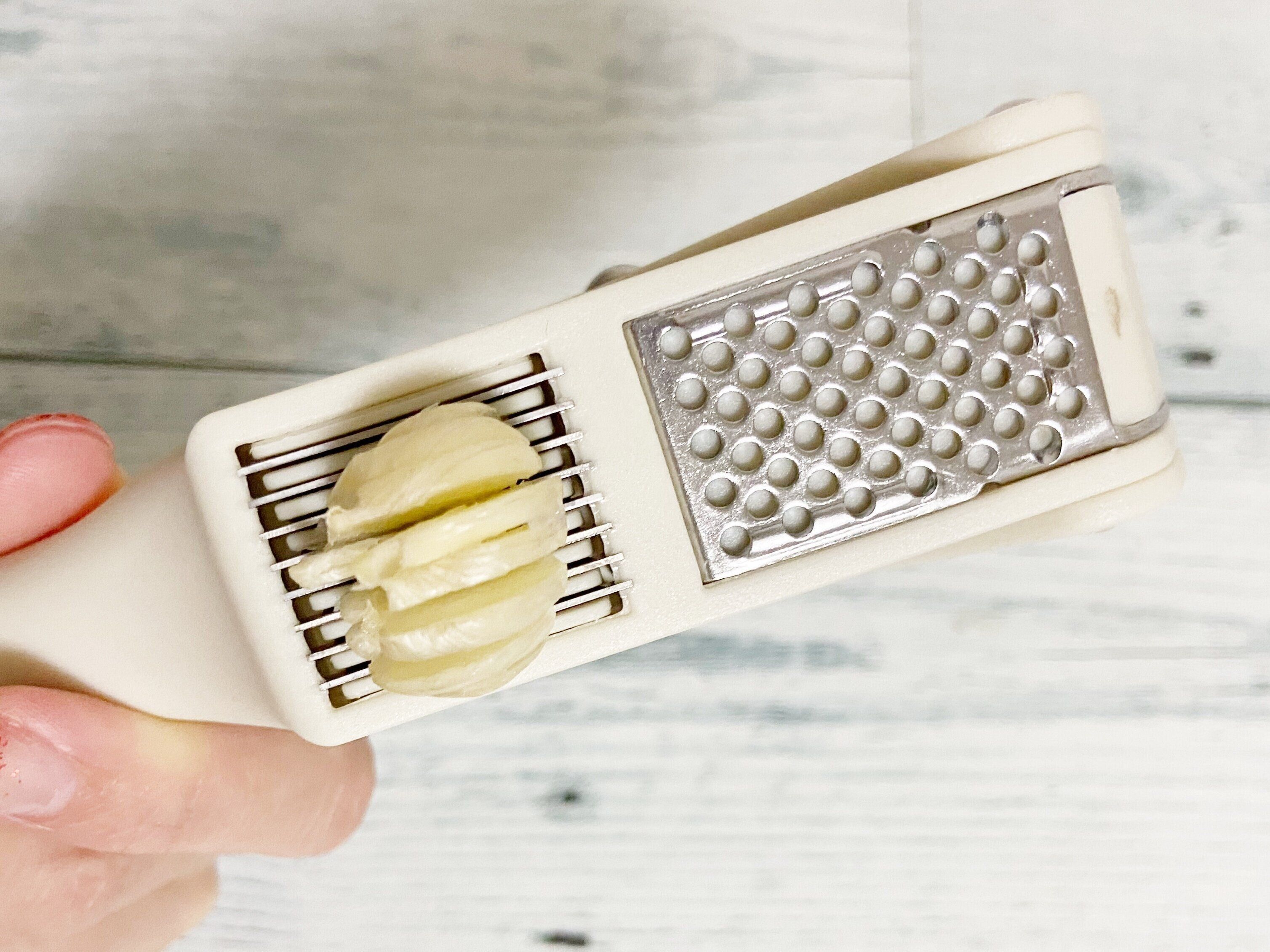 にんにくをセットしたら本体をぐっと握るだけ。コレだけで簡単ににんにくをおろしたり、均等にスライスすることが出来ちゃいます!