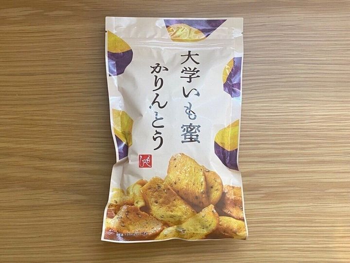 大学いもをイメージしてつくったチップスタイプのかりんとうです。ジッパー付きの袋に入っていて保管しやすいところもオススメポイント。ひと口で食べるには少し大きめのサイズ感です。