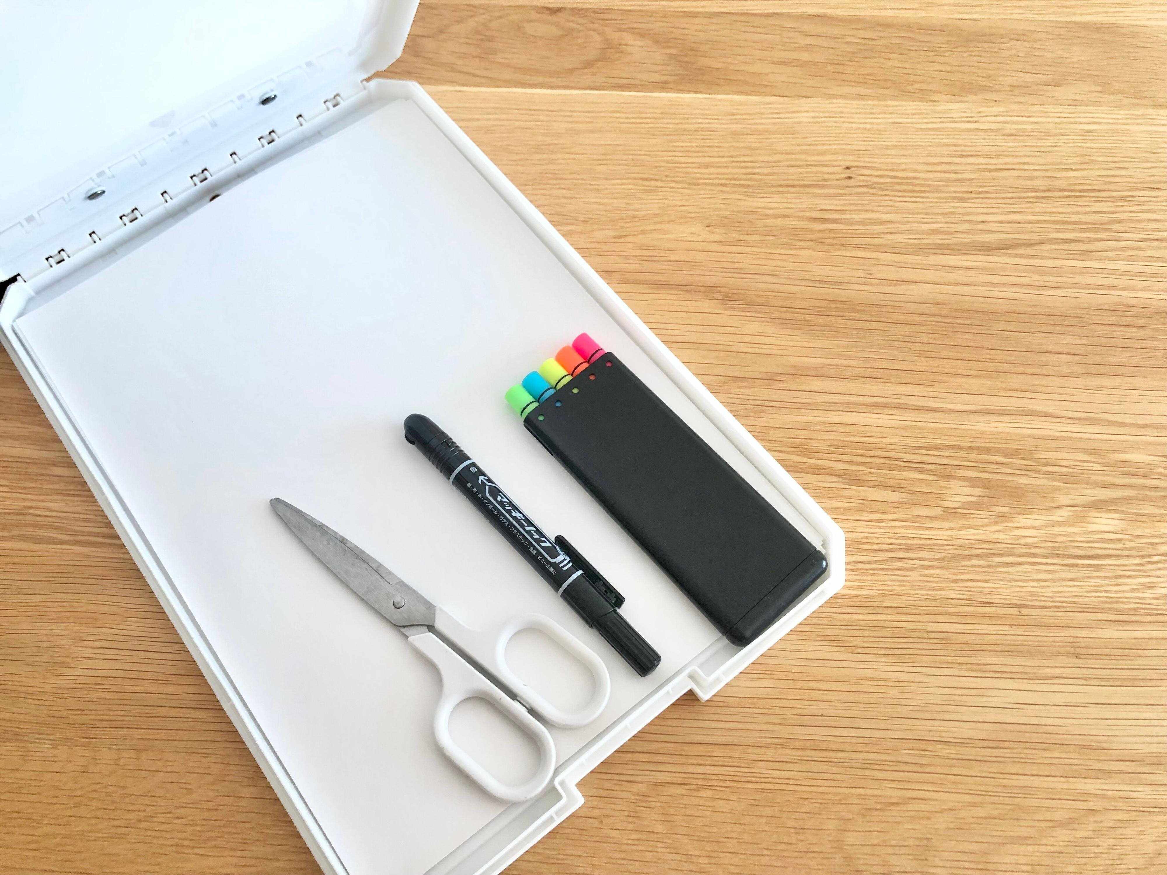 例えば、用紙といっしょに使いたい、ハサミやペン、シールや付箋などの文房具も入れられます。