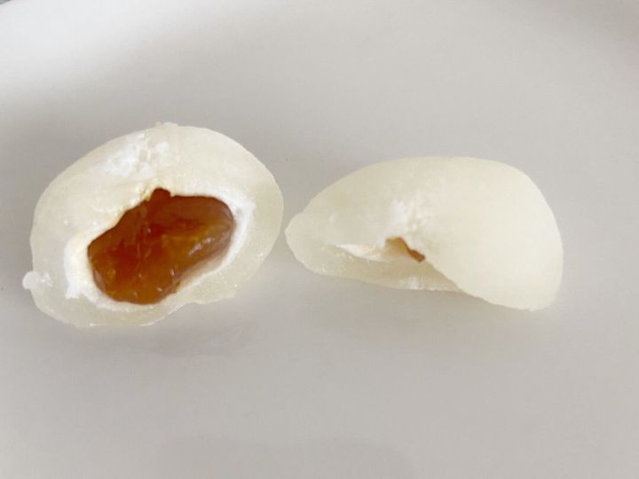 お餅の中にはマシュマロとキャラメルペーストが入っていています。キャラメルペーストがお餅と調和されて、キャラメルなのに和菓子っぽいお味です。緑茶はもちろん、コーヒーや紅茶とも相性のいいおかしもんです。