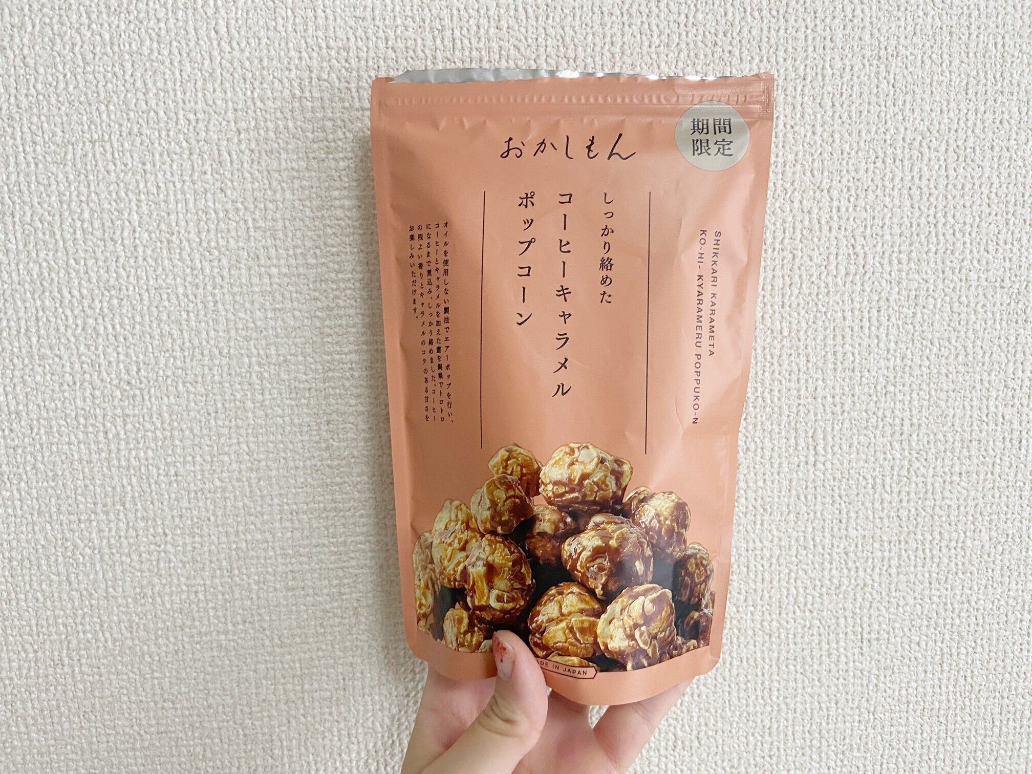 おかしもんの人気シリーズポップコーン。期間限定商品は「しっかり絡めたコーヒーキャラメルポップコーン」(270円)です。