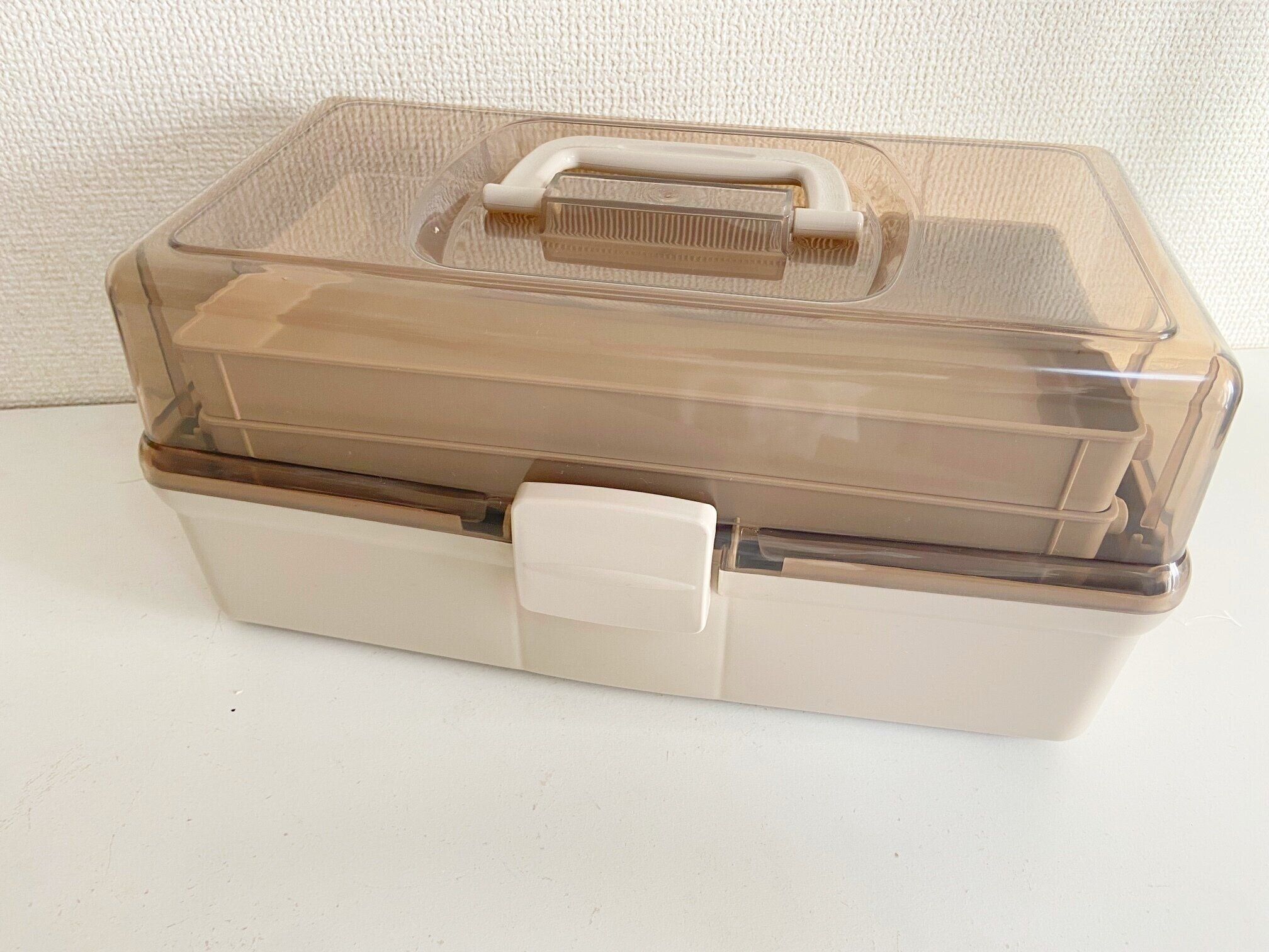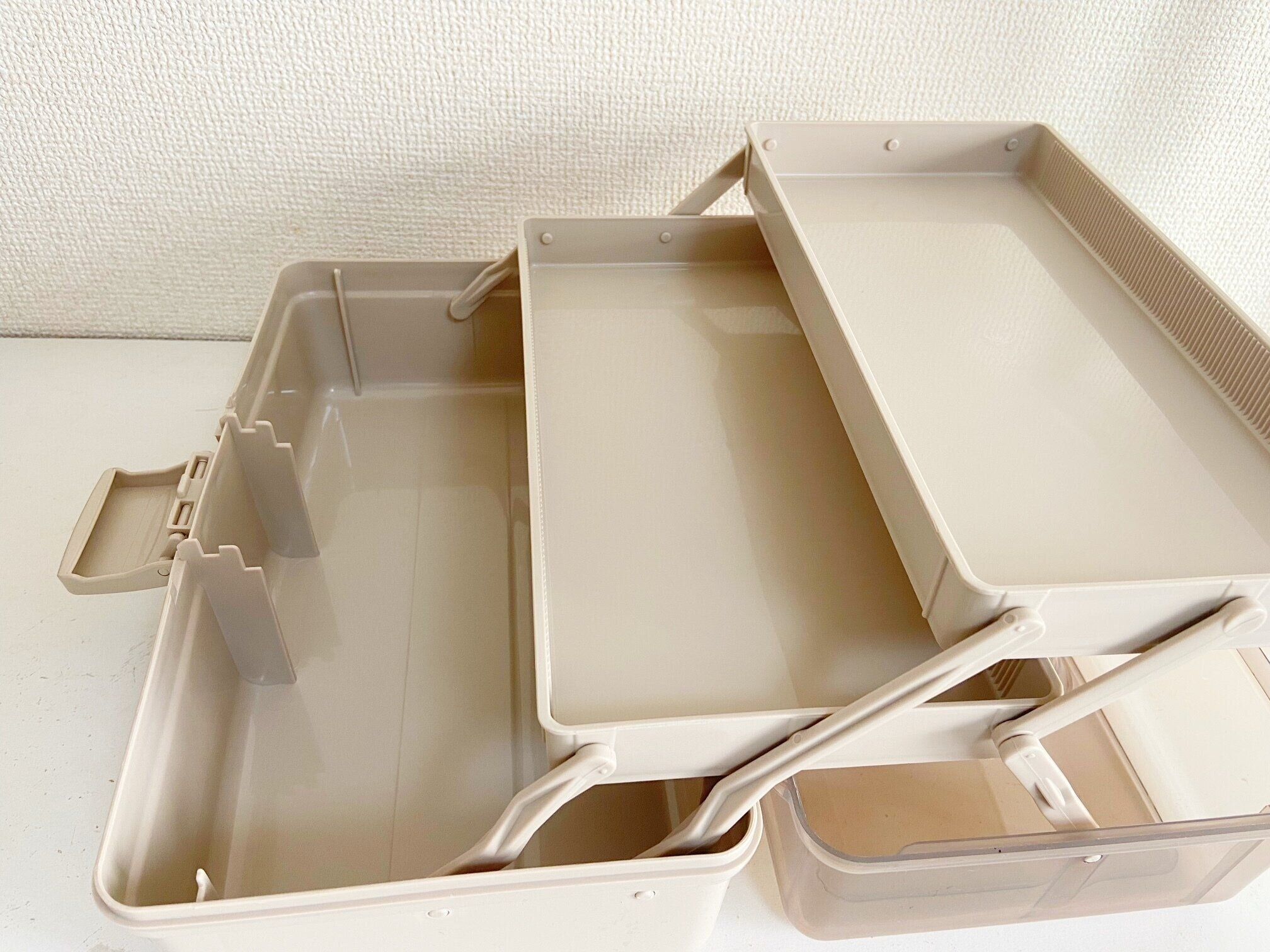 このツールボックスの魅力はなんといっても収納力。開くと3段の収納スペースが登場します。1段目・2段目は写真だと深さがあまりないように見えるのですが約3cmありますよ。薬なども箱のままちょうど入るサイズ感なので、我が家では1つは救急箱として使用しています。ちなみに3段目は深さが約8cmです。