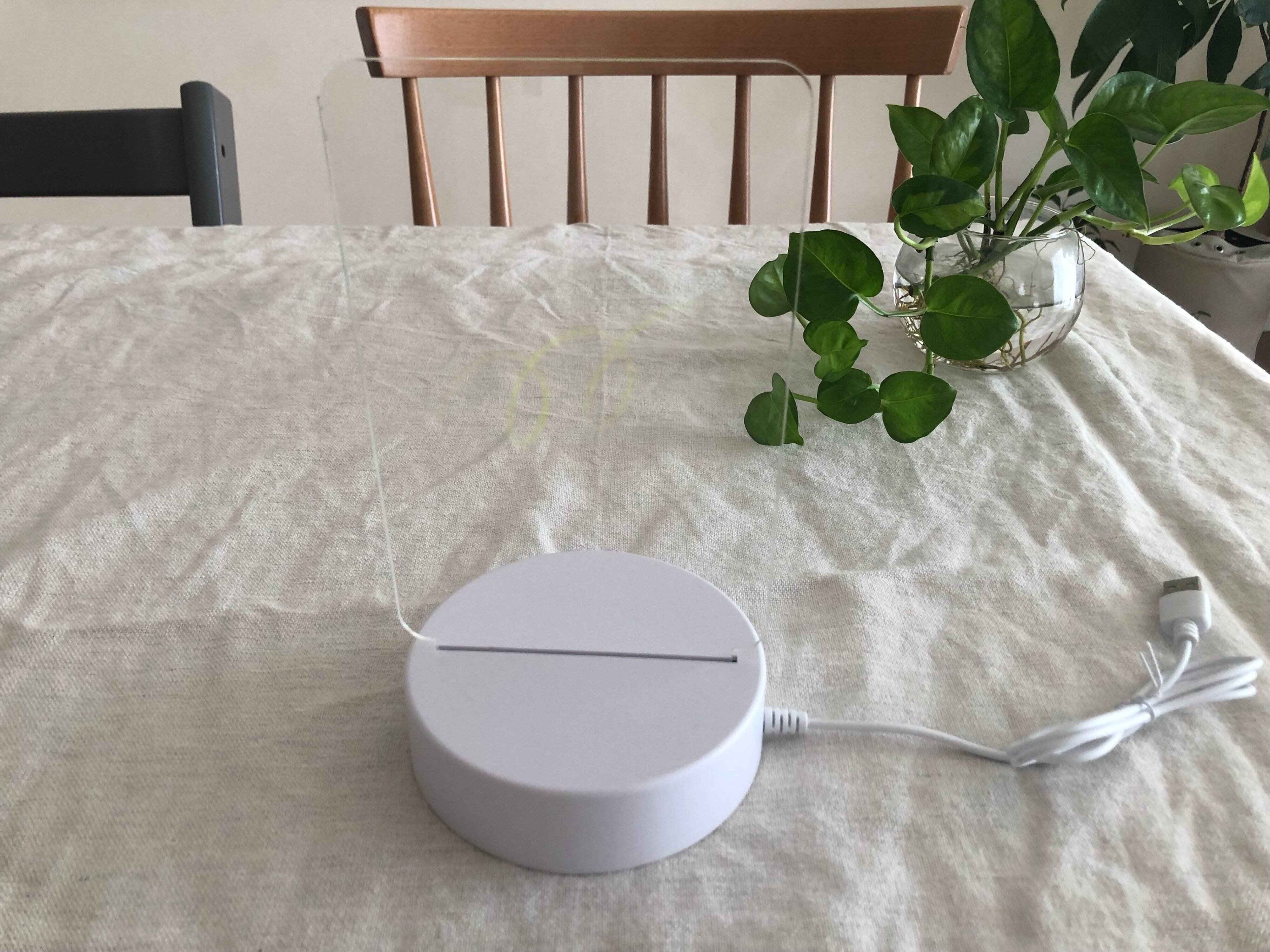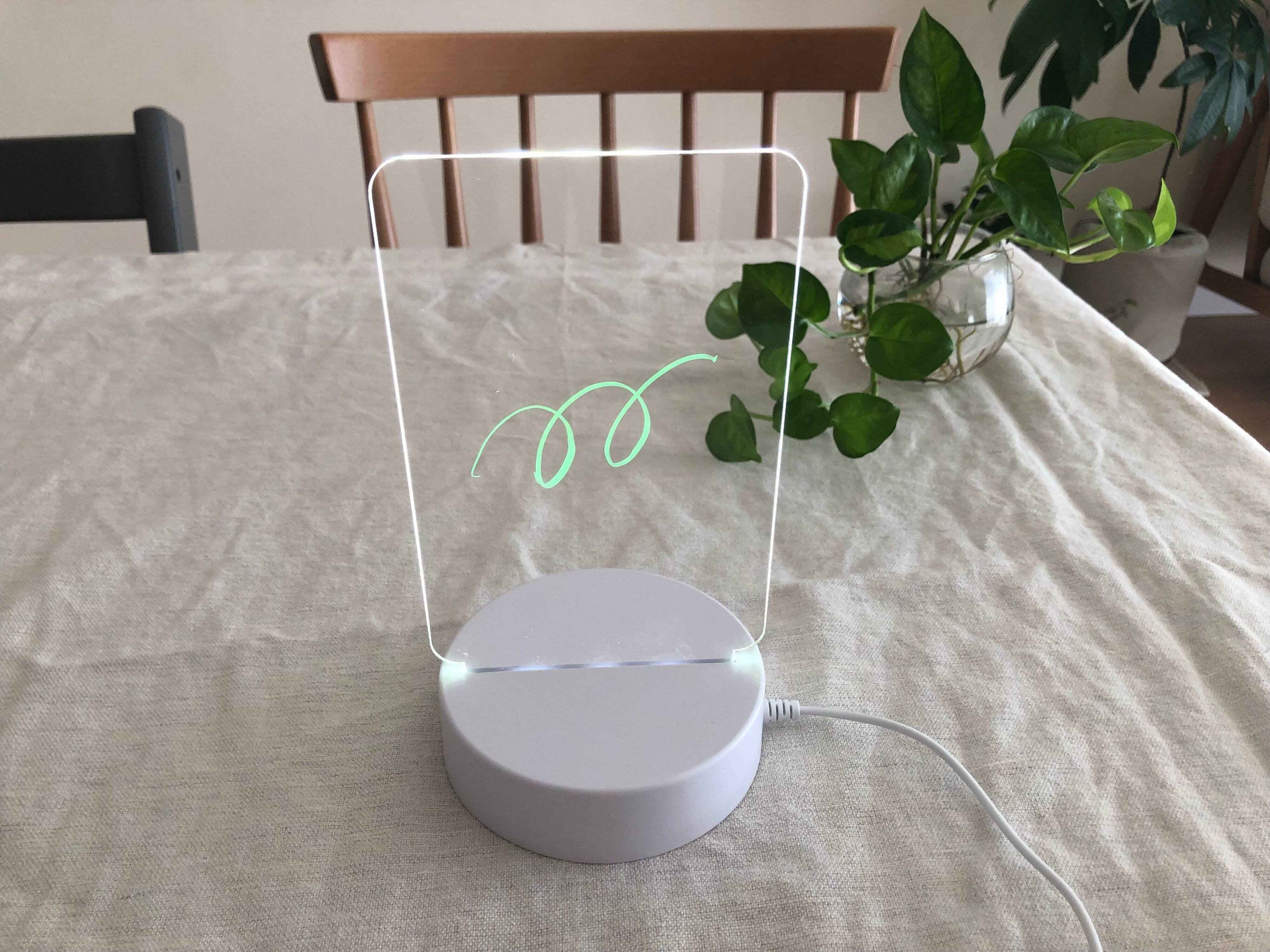 実際にライトを点けてみると、セットした台からのLEDの光で、アクリルボードに書いた文字やイラストが綺麗に光って見えました!