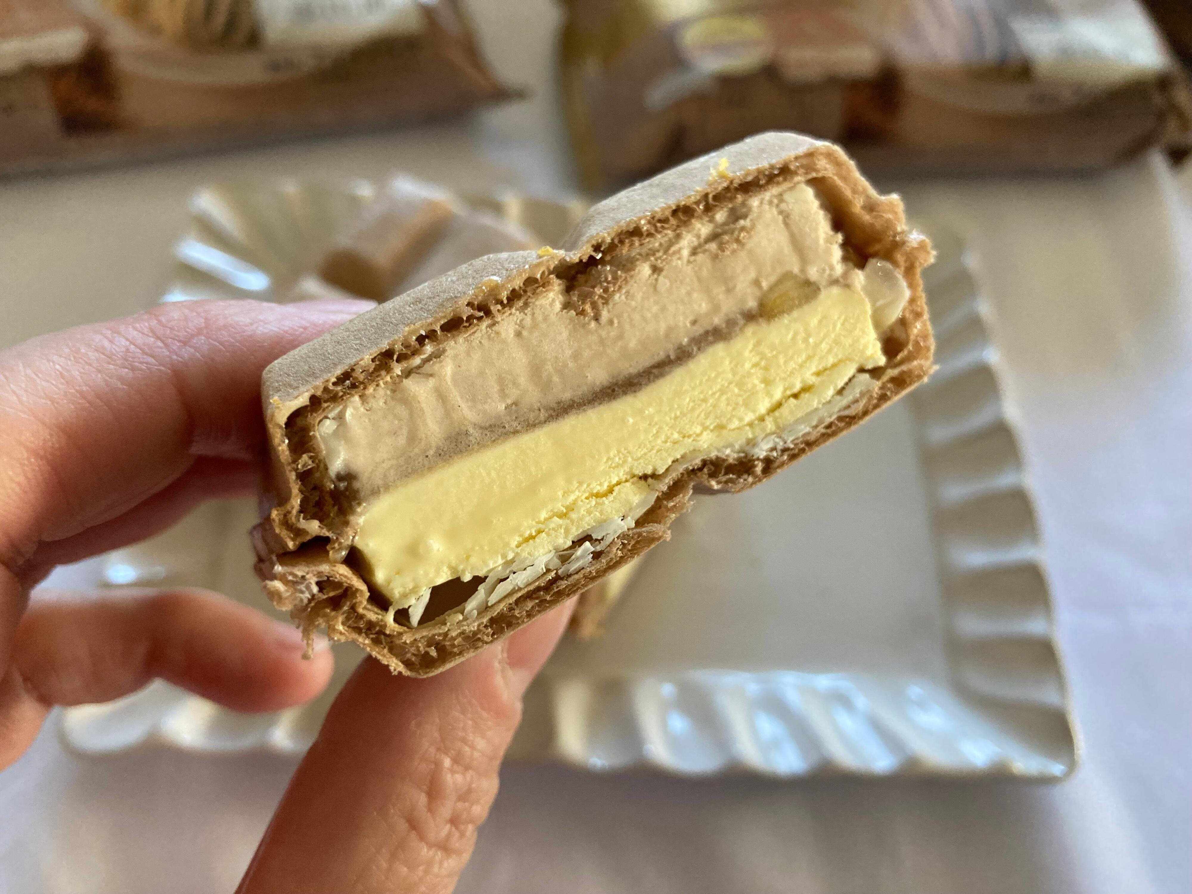 こちらのモナカアイスを袋から出してみると、栗色のモナカアイスが出てきます。