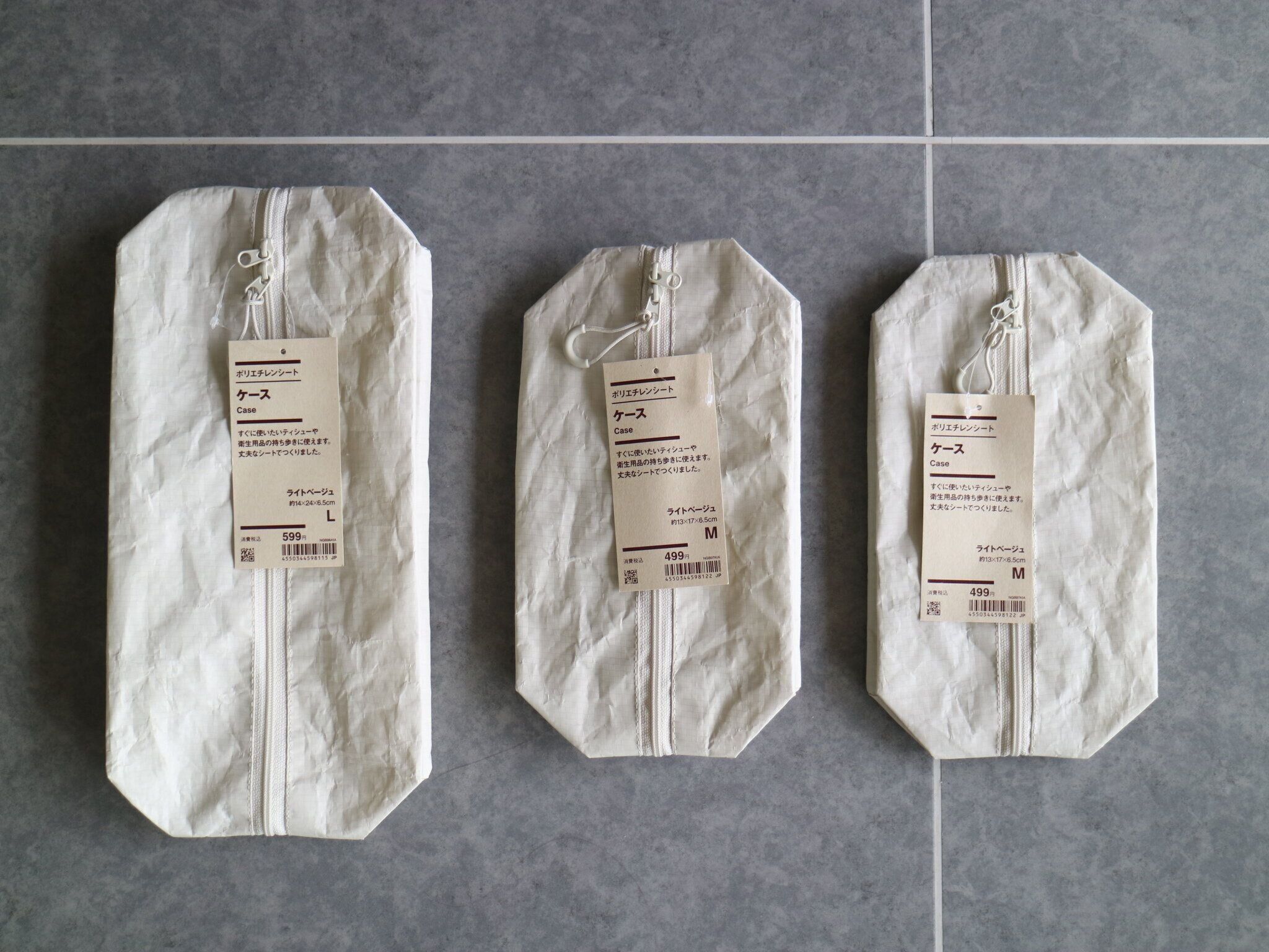 はじめて店頭に並んでいるのをみたとき、この素材と構造に一目惚れし「これは必ずなにかに使えるぞ!!」と確信しました。そんなポリエチレンシートケース、S・M・Lの3サイズがあり、価格は399円、499円、599円です。いまわたしはMサイズ2つとLサイズ1つを愛用しています!