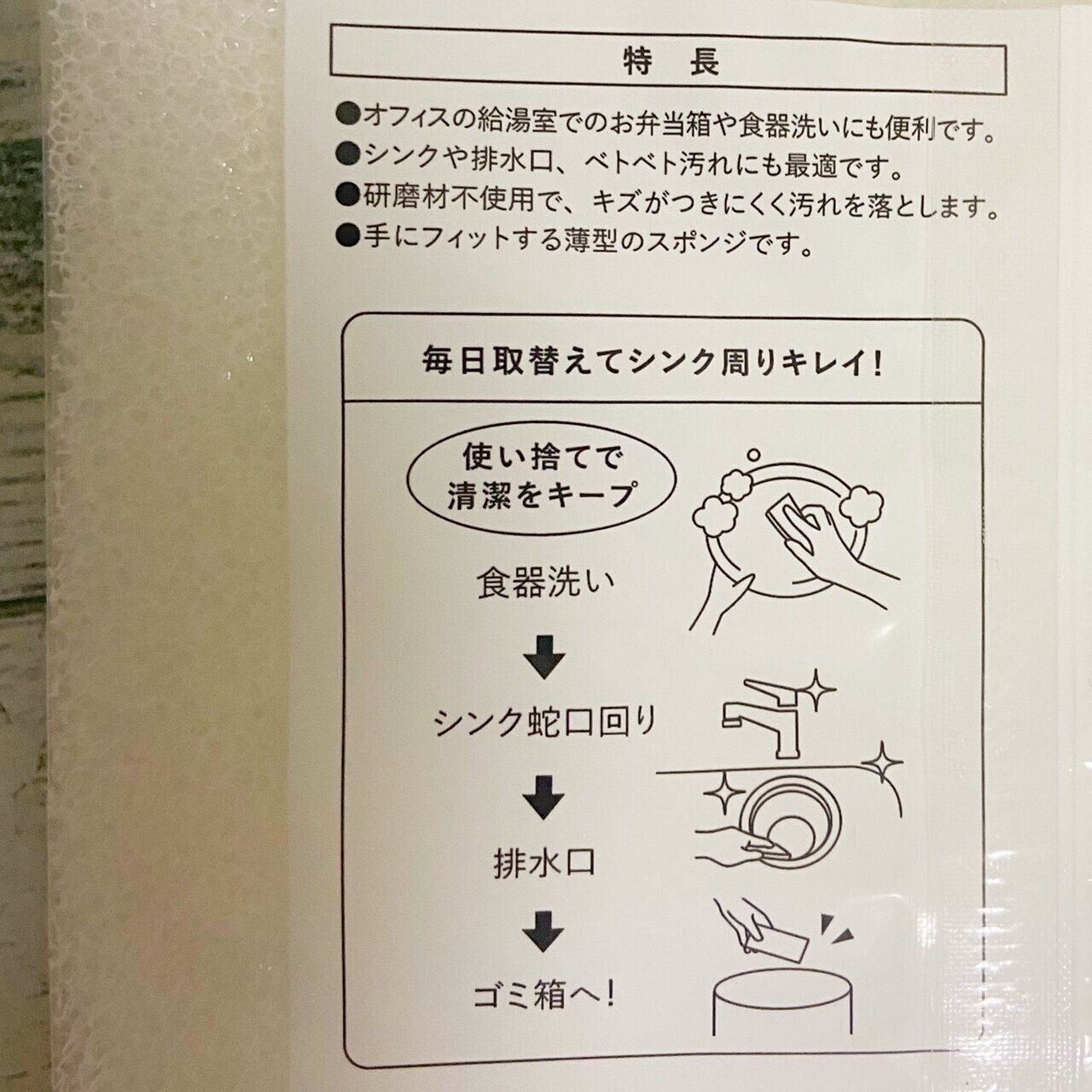 1枚あたり約幅5×高さ9.9×厚さ1cmと薄いスポンジの使用感ですが、薄いからこそ細かい箇所を洗いやすいように感じました。使い捨てなので、カレーや煮込み料理などで使った調理器具を洗う時もスポンジの汚れを気にしなくていいのもうれしいポイントです。ただ、たくさんの食器を洗うのには1枚では少ししんどいかも……というのが正直な感想。メインスポンジというよりはあると嬉しいサブ的ポジションだと思って愛用しています。