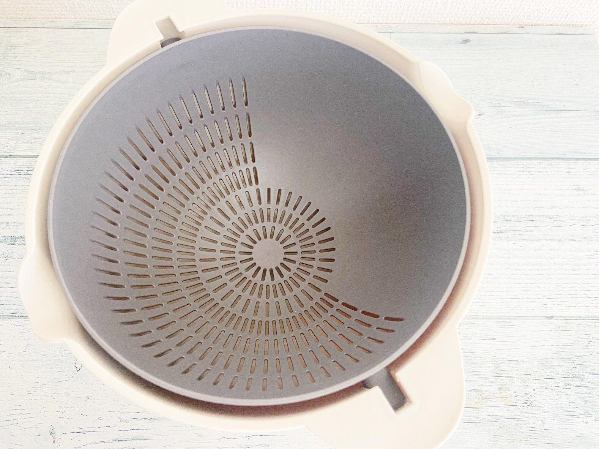 新バージョンの「ボウル」は穴の開いている箇所がなくなり、注ぎ口が2ヵ所になりました。実際に使ってみて思ったのが、穴は開いてない方が使いやすい。「ザル」と「ボウル」が1つになっているので、わざわざ「ボウル」にも「ザル」のような機能は必要ないかも…というのが正直な感想です。洗いやすくなったというのもうれしい改良点!